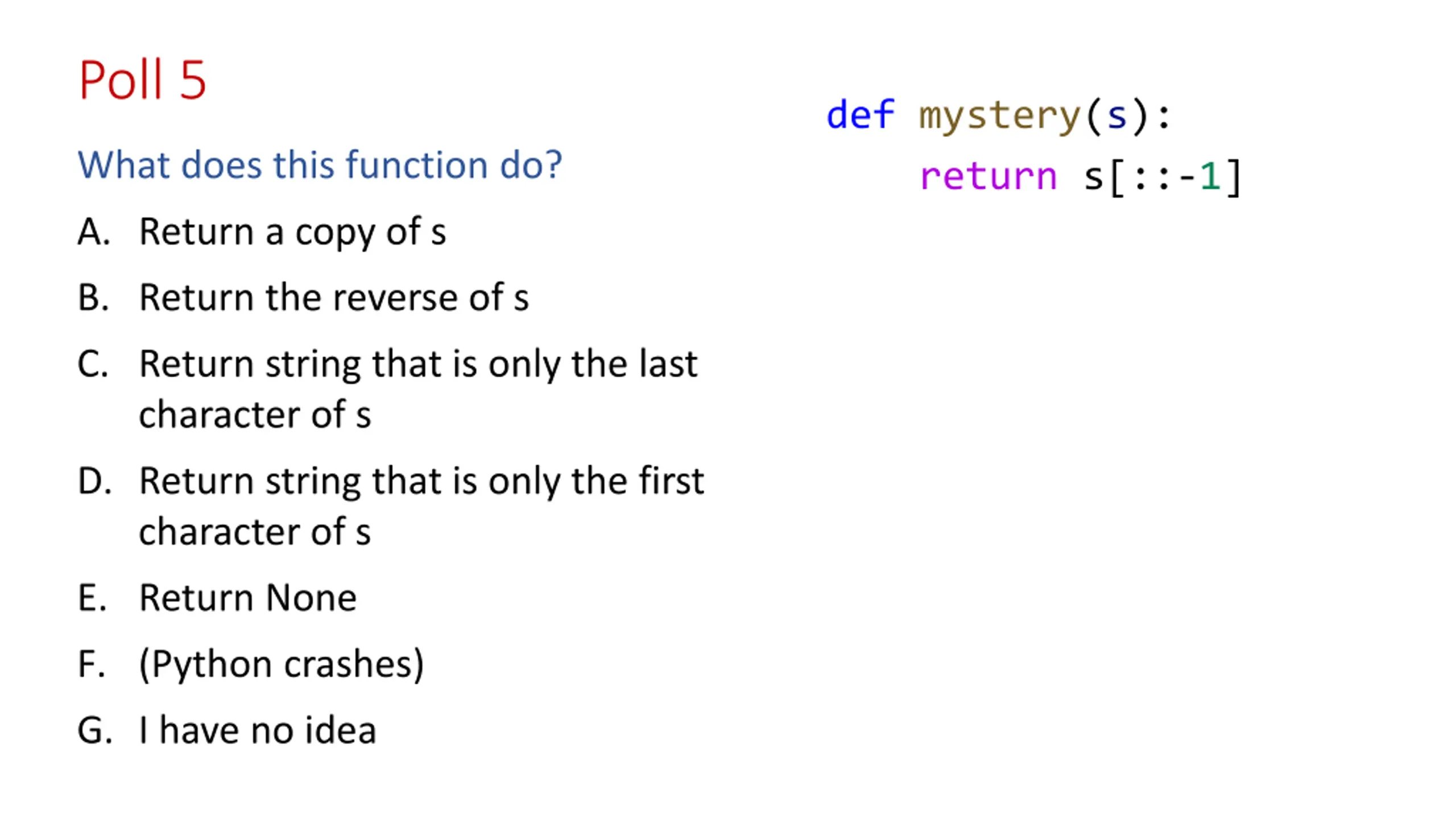 Poll 5 def mystery(s): return s[::-1] What does this function do? A. Return a copy of s B. Return the reverse of s C. Return string that is only the last character of s D. Return string that is only the first character of s E. Return None F. (Python crashes) G. I have no idea