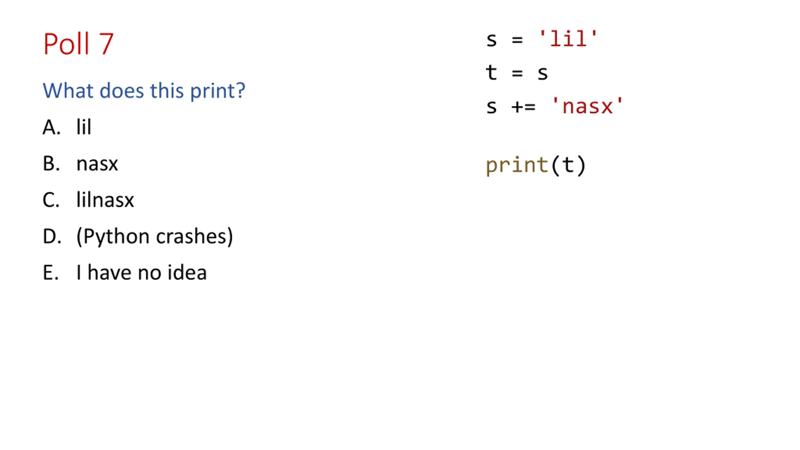 s = 'lil' t = s s += 'nasx' Poll 7 What does this print? A. lil B. nasx print(t) C. lilnasx D. (Python crashes) E. I have no idea