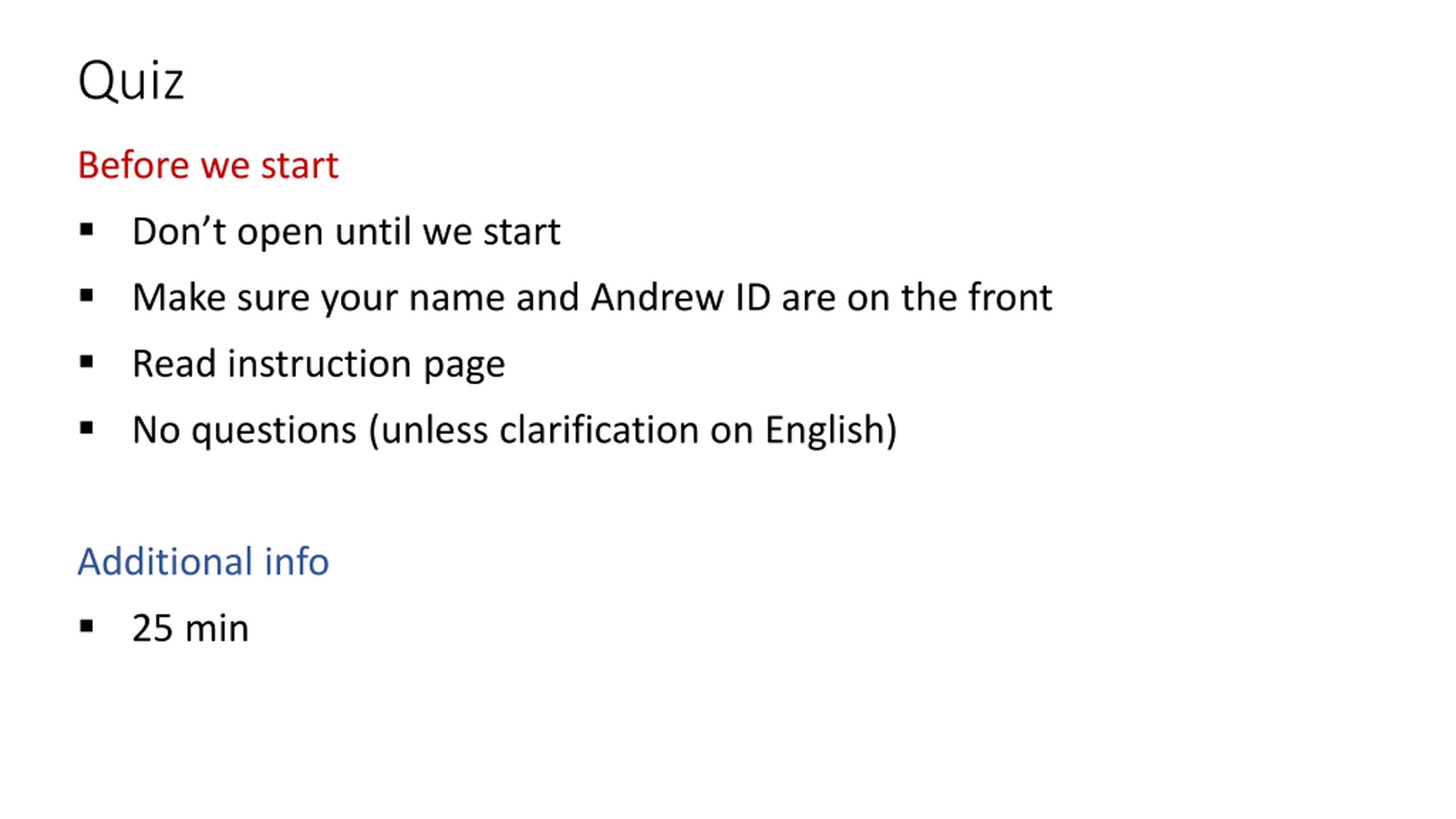 Quiz Before we start Don t open until we start Make sure your name and Andrew ID are on the front Read instruction page No questions (unless clarification on English) Additional info 25 min