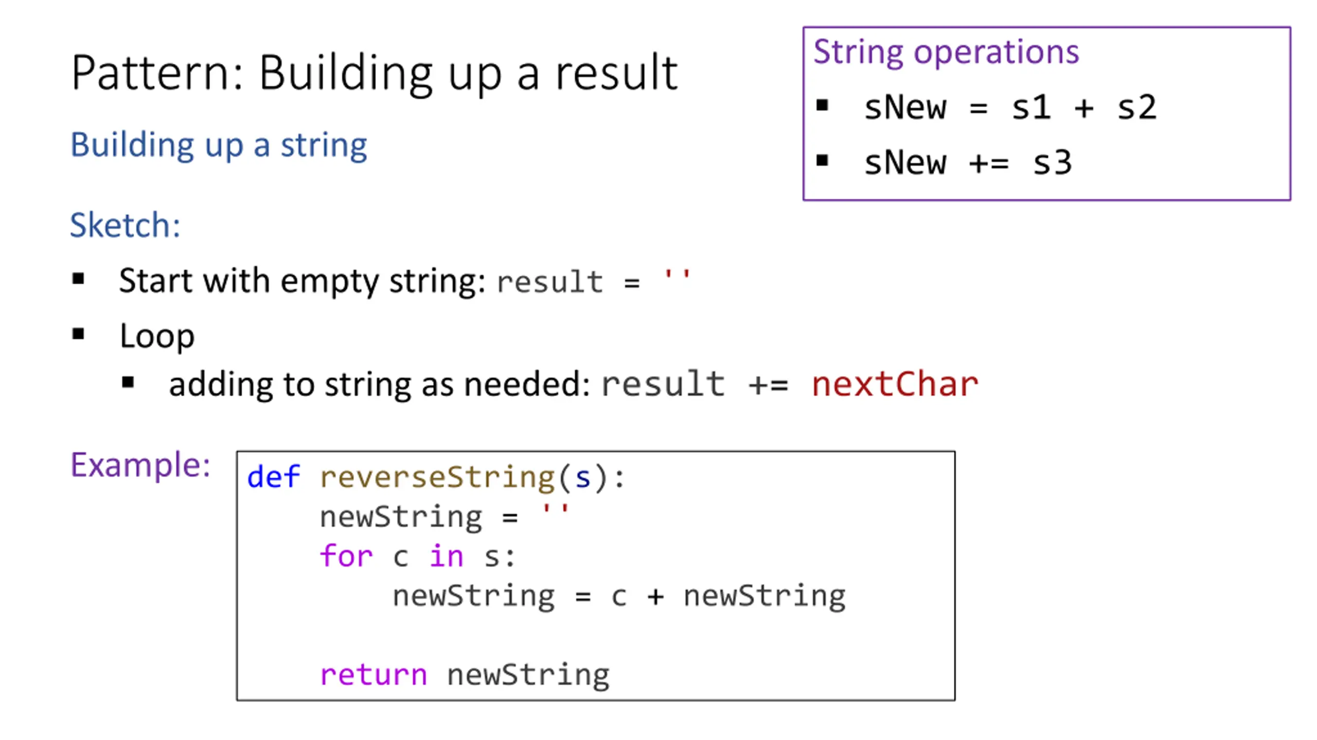 String operations sNew = s1 + s2 sNew += s3 Pattern: Building up a result Building up a string Sketch: Start with empty string: result = '' Loop adding to string as needed: result += nextChar Example: def reverseString(s): newString = '' for c in s: newString = c + newString return newString
