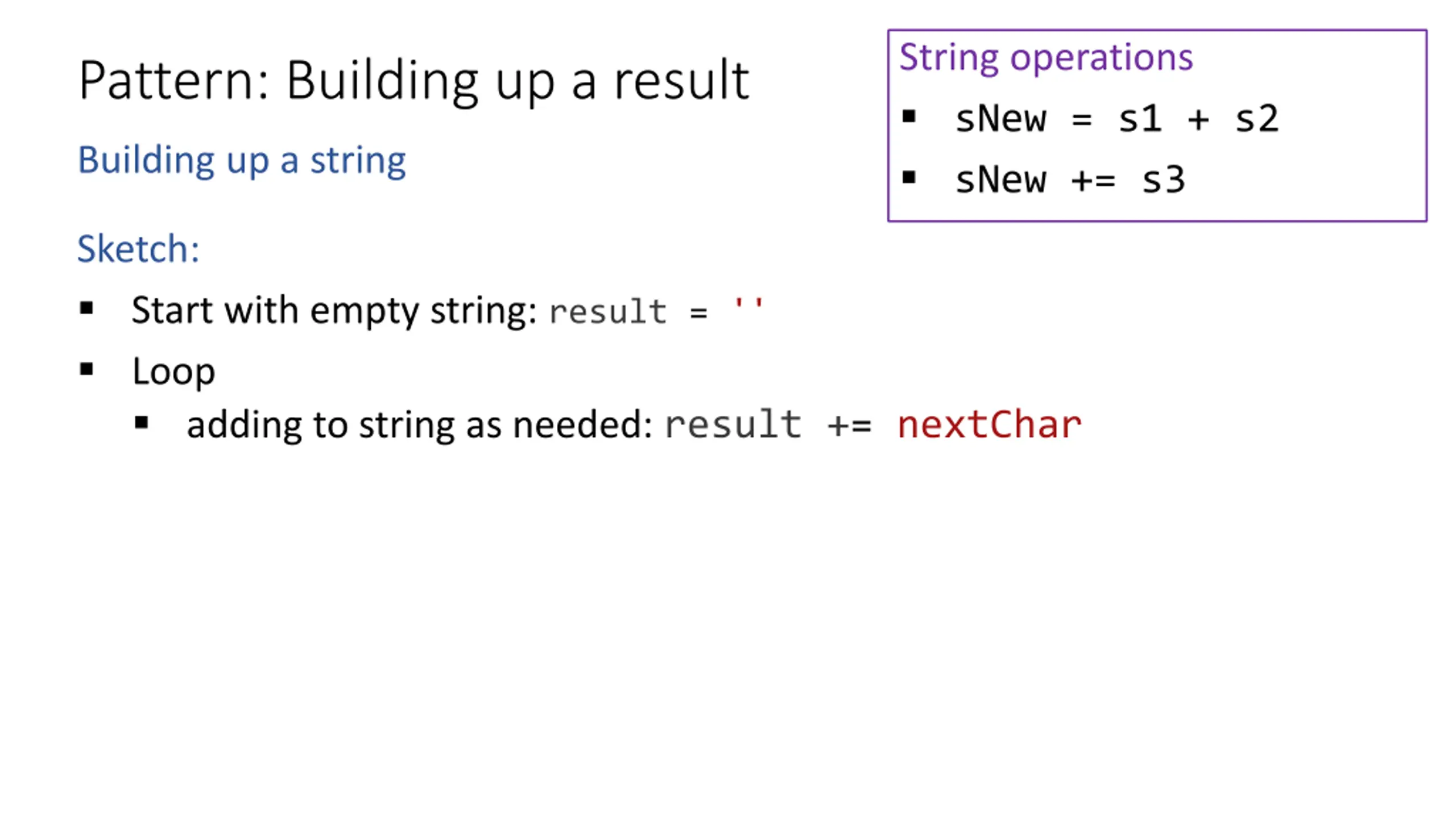 String operations sNew = s1 + s2 sNew += s3 Pattern: Building up a result Building up a string Sketch: Start with empty string: result = '' Loop adding to string as needed: result += nextChar
