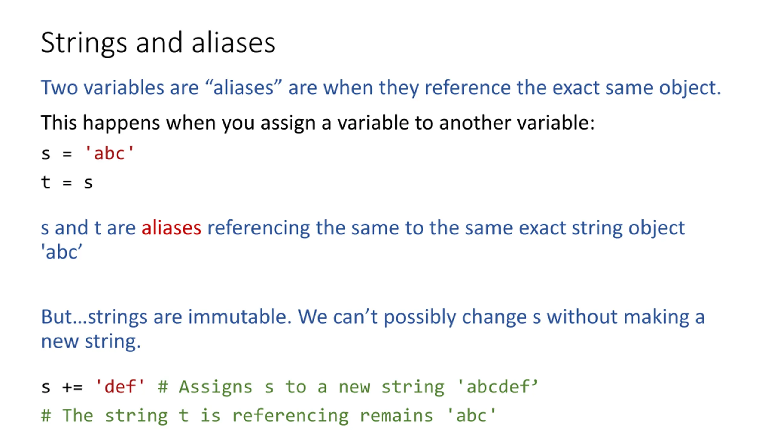 Strings and aliases Two variables are aliases are when they reference the exact same object. This happens when you assign a variable to another variable: s = 'abc' t = s s and t are aliases referencing the same to the same exact string object 'abc But strings are immutable. We can t possibly change s without making a new string. s += 'def' # Assigns s to a new string 'abcdef # The string t is referencing remains 'abc'