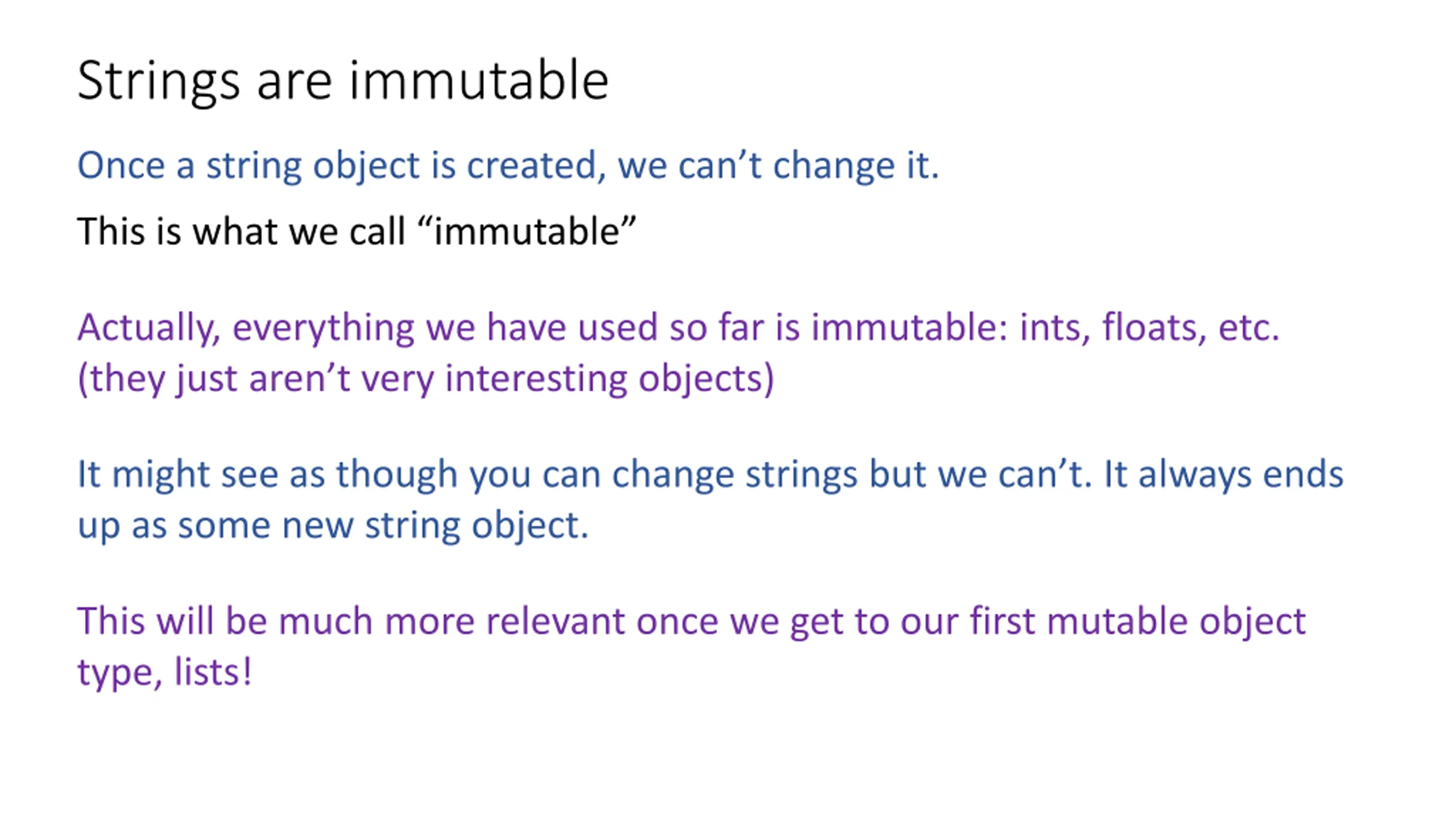 Strings are immutable Once a string object is created, we can t change it. This is what we call immutable Actually, everything we have used so far is immutable: ints, floats, etc. (they just aren t very interesting objects) It might see as though you can change strings but we can t. It always ends up as some new string object. This will be much more relevant once we get to our first mutable object type, lists!