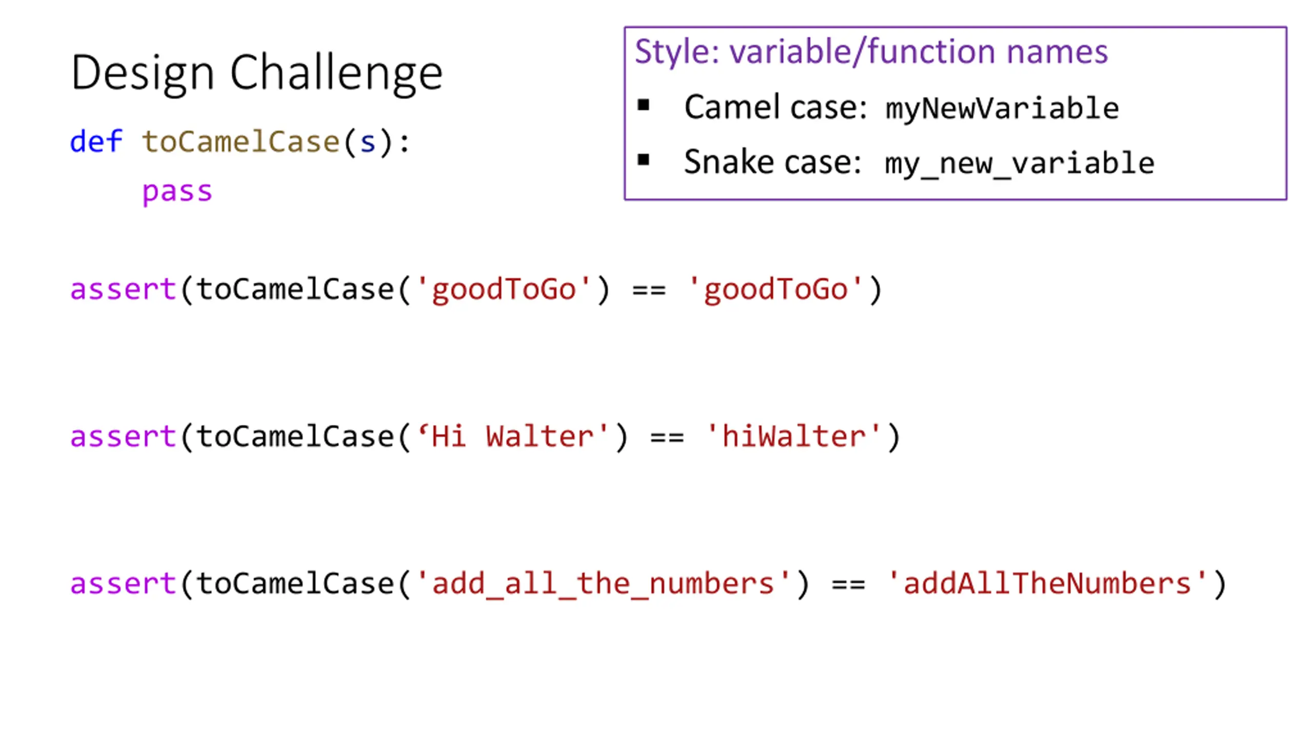 Style: variable/function names Camel case: myNewVariable Snake case: my_new_variable Design Challenge def toCamelCase(s): pass assert(toCamelCase('goodToGo') == 'goodToGo') assert(toCamelCase( Hi Walter') == 'hiWalter') assert(toCamelCase('add_all_the_numbers') == 'addAllTheNumbers')