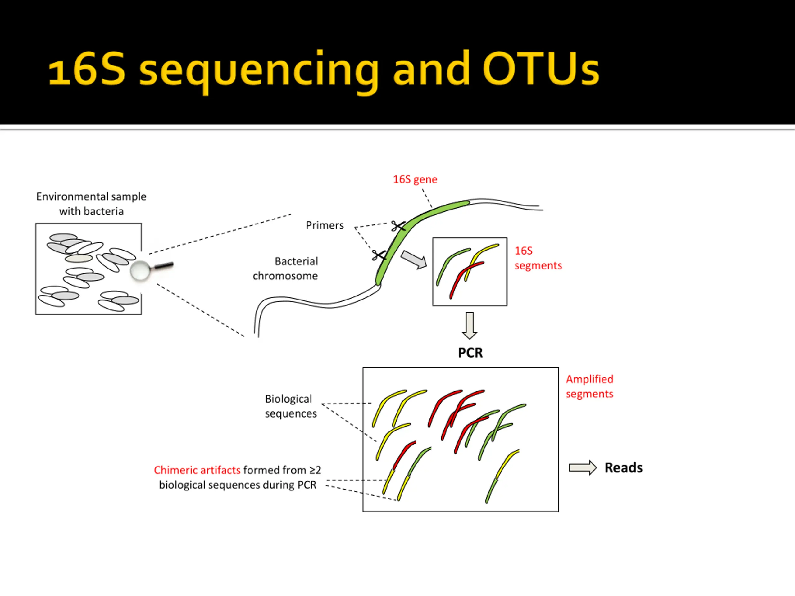 16S gene Environmental sample with bacteria Primers 16S segments Bacterial chromosome PCR Amplified segments Biological sequences Reads Chimeric artifacts formed from 2 biological sequences during PCR