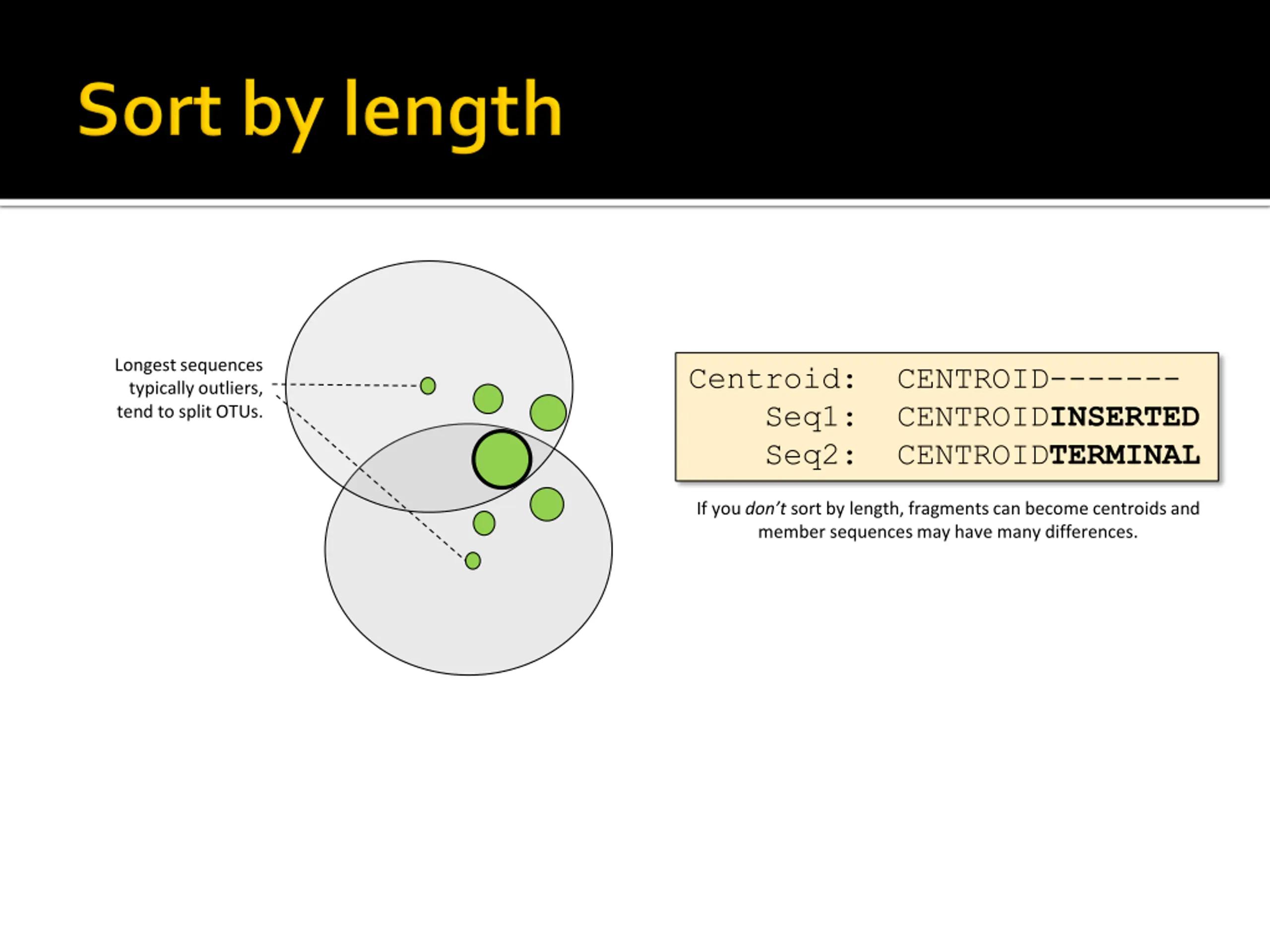Longest sequences typically outliers, tend to split OTUs. Centroid: CENTROID------- Seq1: CENTROIDINSERTED Seq2: CENTROIDTERMINAL If you don t sort by length, fragments can become centroids and member sequences may have many differences.