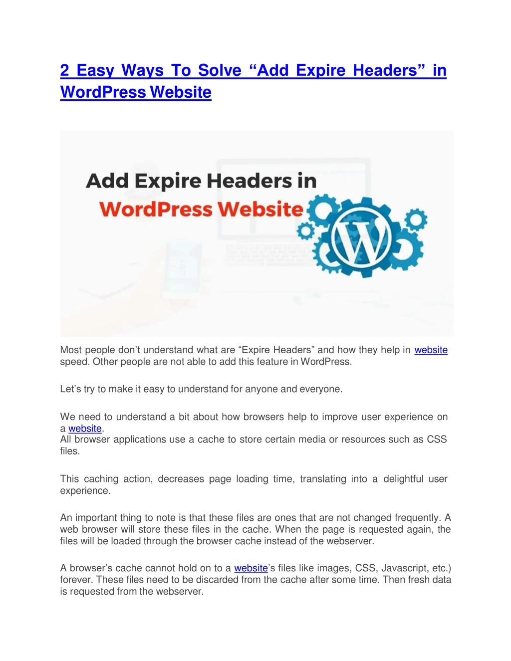 2 Easy Ways To Solve Add Expire Headers in WordPress Website Most people don t understand what are ExpireHeaders and how they help in website speed. Other people are not able to add this feature in WordPress. Let s try to make it easy to understand for anyone and everyone. We need to understand a bit about how browsers help to improve user experience on a website. All browser applications use a cache to store certain media or resources such as CSS files. This caching action, decreases page loading time, translating into a delightful user experience. An important thing to note is that these files are ones that are not changed frequently. A web browser will store these files in the cache. When the page is requested again, the files will be loaded through the browser cache instead of the webserver. A browser s cache cannot hold on to a website s files like images, CSS, Javascript, etc.) forever. These files need to be discarded from the cache after some time. Then fresh data is requested from the webserver.