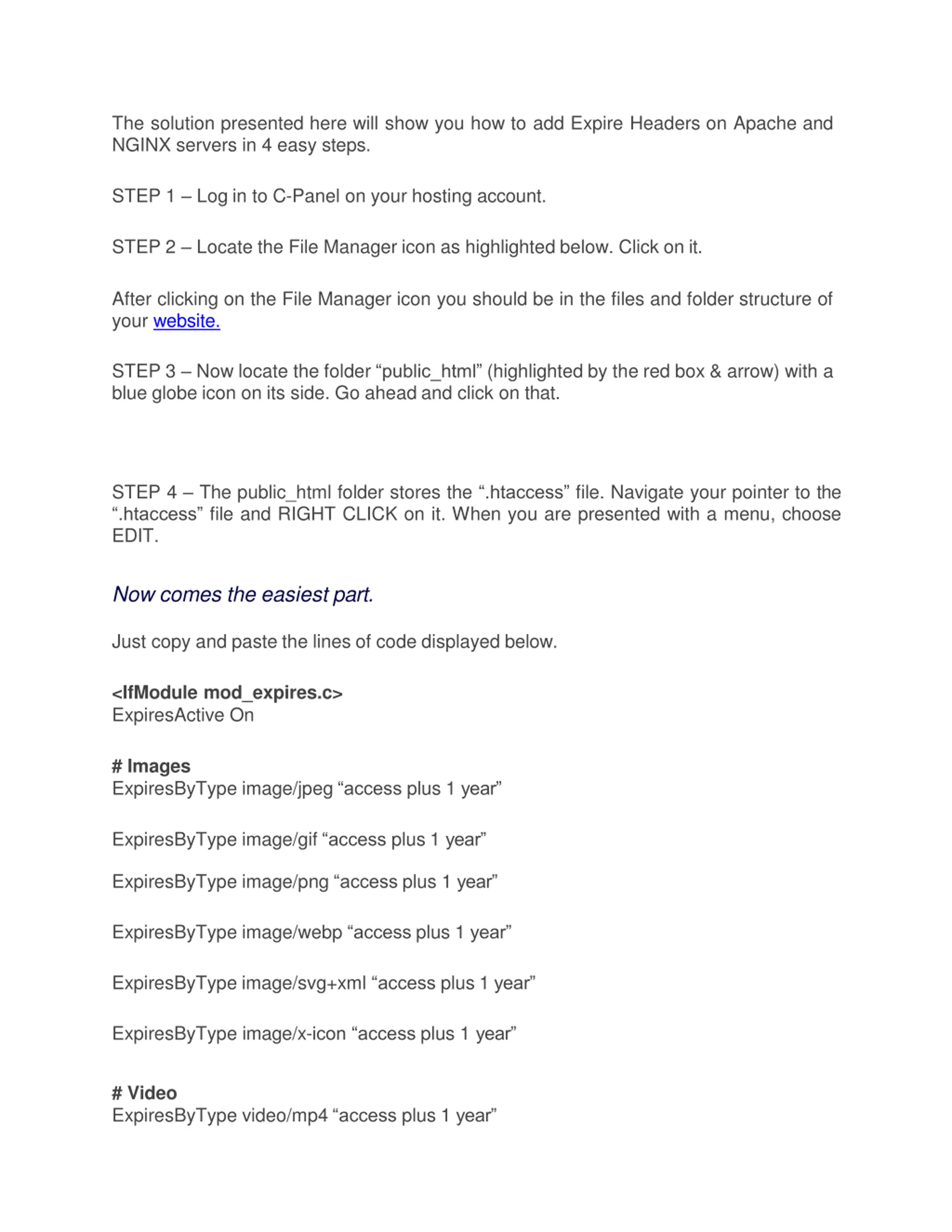 The solution presented here will show you how to add Expire Headers on Apache and NGINX servers in 4 easy steps. STEP 1 Log in to C-Panel on your hosting account. STEP 2 Locate the File Manager icon as highlighted below. Click on it. After clicking on the File Manager icon you should be in the files and folder structure of your website. STEP 3 Now locate the folder public_html (highlighted by the red box & arrow) with a blue globe icon on its side. Go ahead and click on that. STEP 4 The public_html folder stores the .htaccess file. Navigate your pointer to the .htaccess file and RIGHT CLICK on it. When you are presented with a menu, choose EDIT. Now comes the easiest part. Just copy and paste the lines of code displayed below. <IfModule mod_expires.c> ExpiresActive On # Images ExpiresByType image/jpeg access plus 1 year ExpiresByType image/gif access plus 1 year ExpiresByType image/png access plus 1 year ExpiresByType image/webp access plus 1 year ExpiresByType image/svg+xml access plus 1 year ExpiresByType image/x-icon access plus 1 year # Video ExpiresByType video/mp4 access plus 1 year