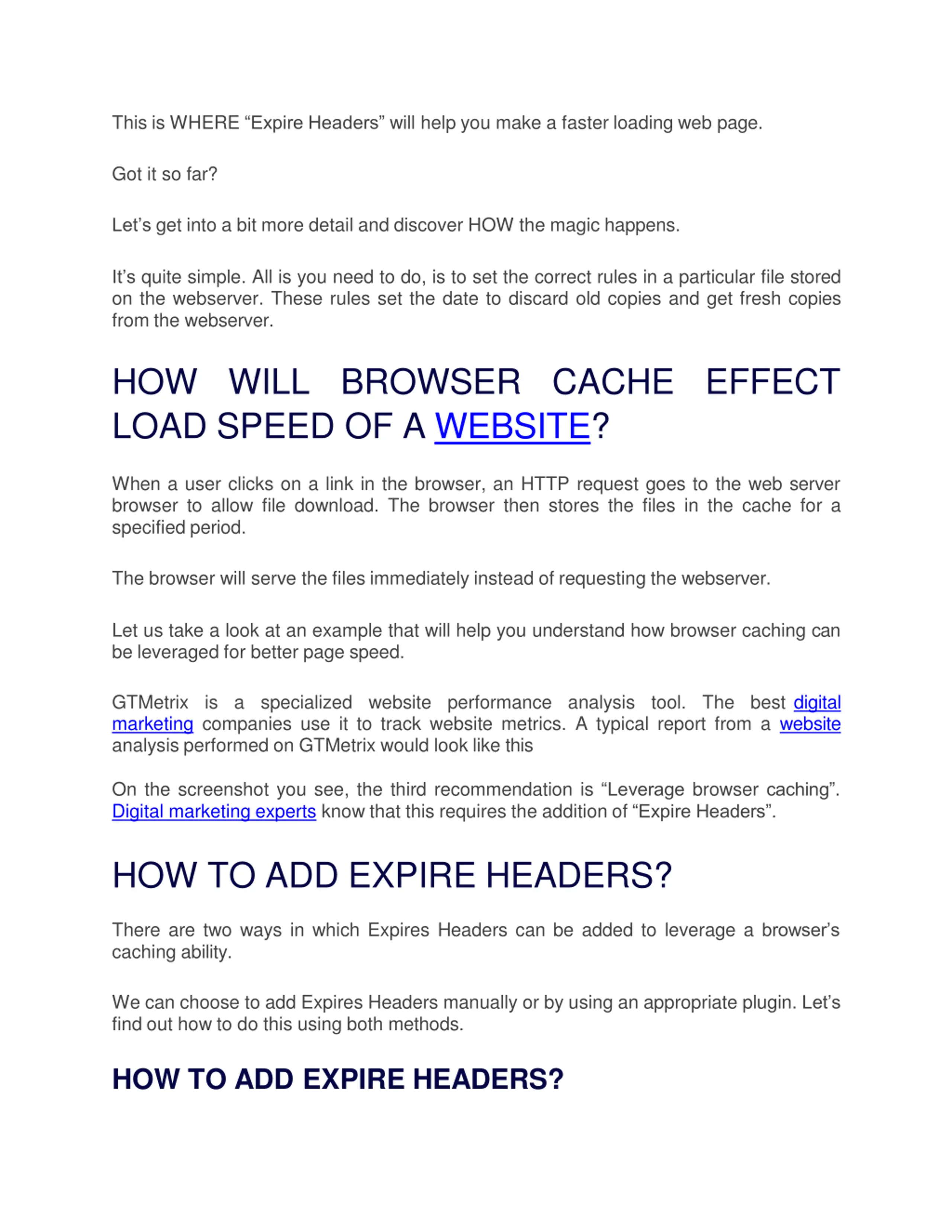This is WHERE ExpireHeaders will help you make a faster loading web page. Got it so far? Let s get into a bit more detail and discover HOW the magic happens. It s quite simple. All is you need to do, is to set the correct rules in a particular file stored on the webserver. These rules set the date to discard old copies and get fresh copies from the webserver. HOW WILL BROWSER CACHE EFFECT LOAD SPEED OF A WEBSITE? When a user clicks on a link in the browser, an HTTP request goes to the web server browser to allow file download. The browser then stores the files in the cache for a specified period. The browser will serve the files immediately instead of requesting the webserver. Let us take a look at an example that will help you understand how browser caching can be leveraged for better page speed. GTMetrix is a specialized website performance analysis tool. The best digital marketing companies use it to track website metrics. A typical report from a website analysis performed on GTMetrix would look like this On the screenshot you see, the third recommendation is Leverage browser caching . Digital marketing experts know that this requires the addition of ExpireHeaders . HOW TO ADD EXPIRE HEADERS? There are two ways in which Expires Headers can be added to leverage a browser s caching ability. We can choose to add Expires Headers manually or by using an appropriate plugin. Let s find out how to do this using both methods. HOW TO ADD EXPIRE HEADERS?