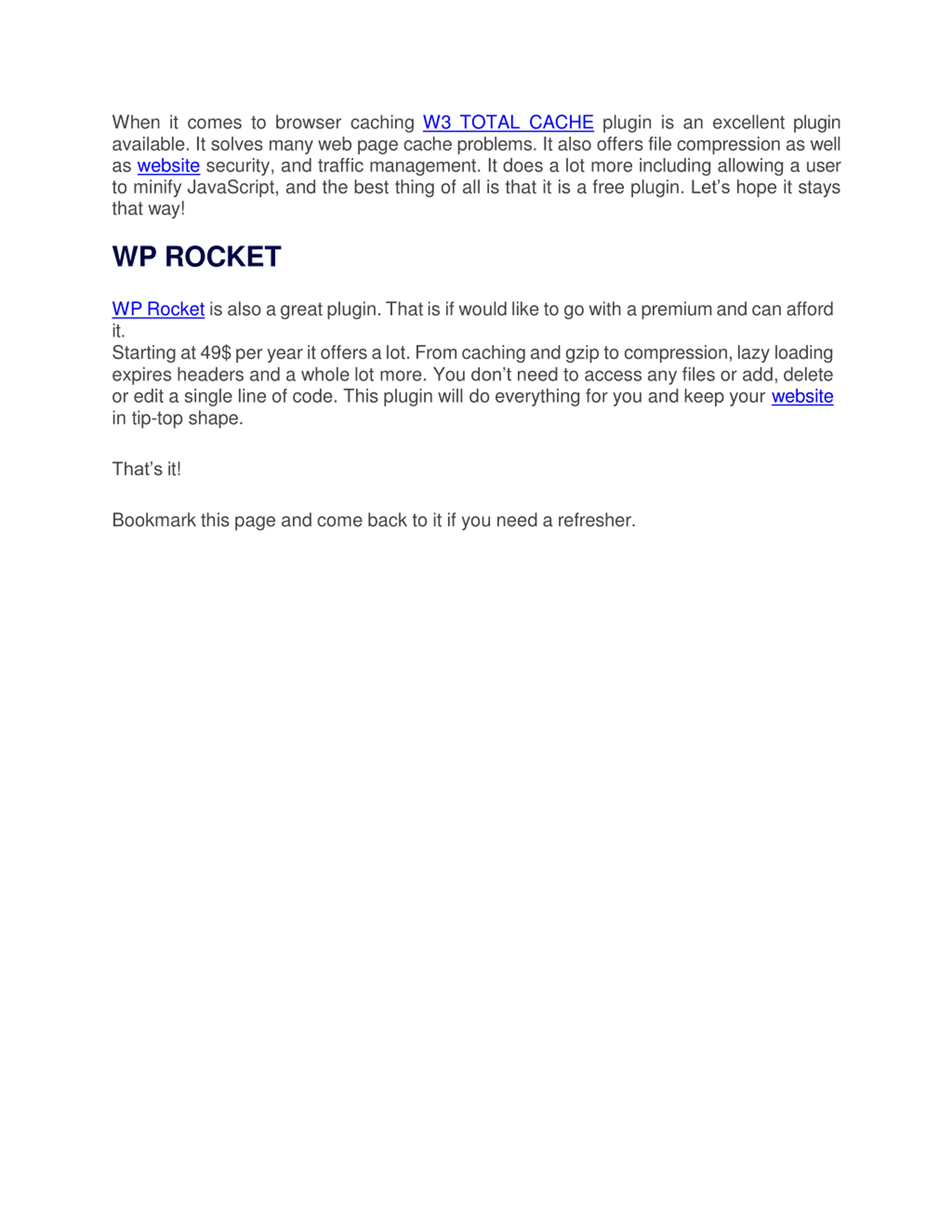 When it comes to browser caching W3 TOTAL CACHE plugin is an excellent plugin available. It solves many web page cache problems. It also offers file compression as well as website security, and traffic management. It does a lot more including allowing a user to minify JavaScript, and the best thing of all is that it is a free plugin. Let s hope it stays that way! WP ROCKET WP Rocket is also a great plugin. That is if would like to go with a premium and can afford it. Starting at 49$ per year it offers a lot. From caching and gzip to compression, lazy loading expires headers and a whole lot more. You don t need to access any files or add, delete or edit a single line of code. This plugin will do everything for you and keep your website in tip-top shape. That s it! Bookmark this page and come back to it if you need a refresher.