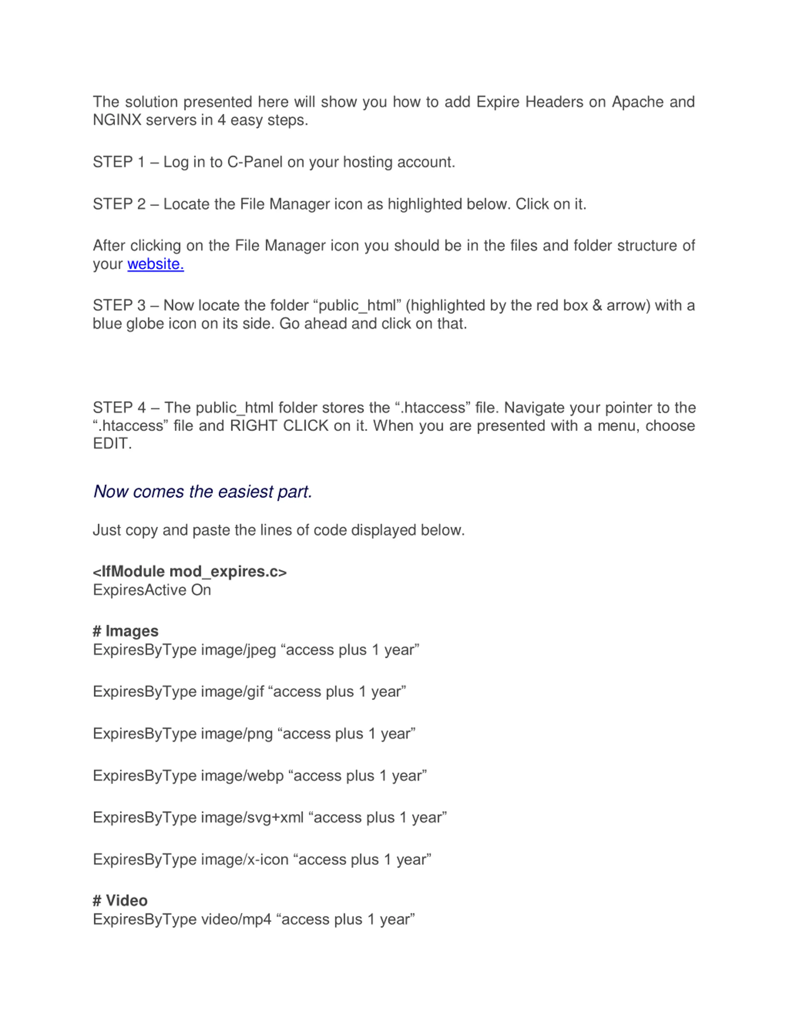 The solution presented here will show you how to add Expire Headers on Apache and NGINX servers in 4 easy steps. STEP 1 Log in to C-Panel on your hosting account. STEP 2 Locate the File Manager icon as highlighted below. Click on it. After clicking on the File Manager icon you should be in the files and folder structure of your website. STEP 3 Now locate the folder public_html (highlighted by the red box & arrow) with a blue globe icon on its side. Go ahead and click on that. STEP 4 The public_html folder stores the .htaccess file. Navigate your pointer to the .htaccess file and RIGHT CLICK on it. When you are presented with a menu, choose EDIT. Now comes the easiest part. Just copy and paste the lines of code displayed below. <IfModule mod_expires.c> ExpiresActive On # Images ExpiresByType image/jpeg access plus 1 year ExpiresByType image/gif access plus 1 year ExpiresByType image/png access plus 1 year ExpiresByType image/webp access plus 1 year ExpiresByType image/svg+xml access plus 1 year ExpiresByType image/x-icon access plus 1 year # Video ExpiresByType video/mp4 access plus 1 year