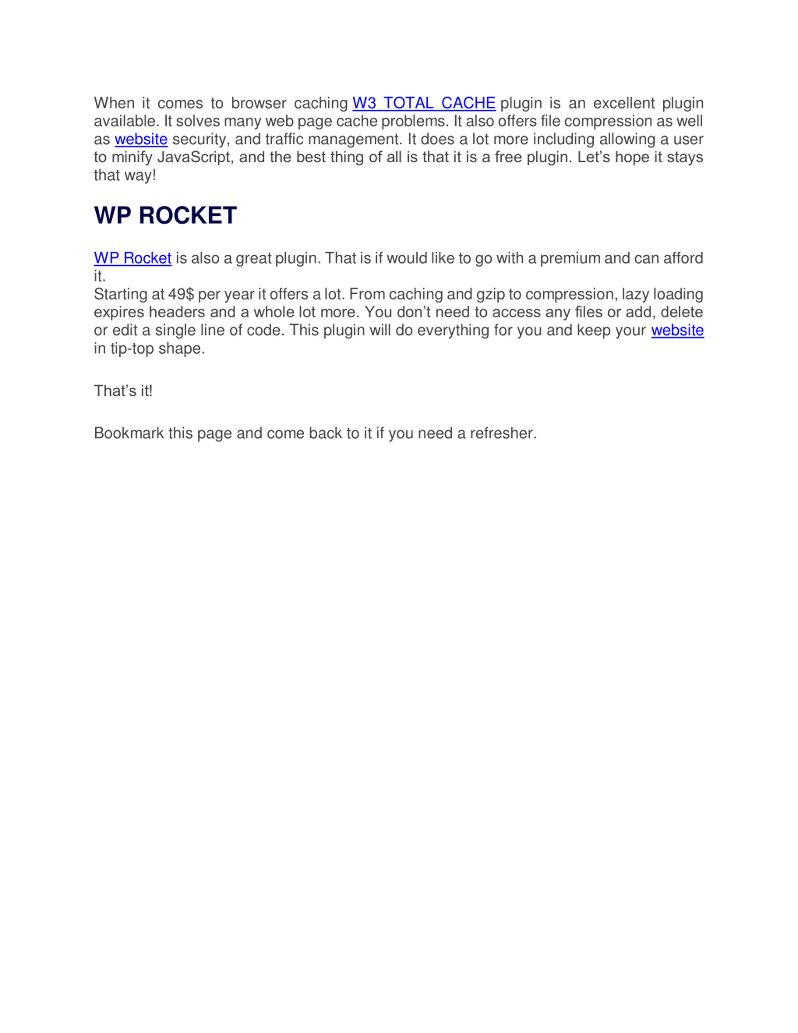 When it comes to browser caching W3 TOTAL CACHE plugin is an excellent plugin available. It solves many web page cache problems. It also offers file compression as well as website security, and traffic management. It does a lot more including allowing a user to minify JavaScript, and the best thing of all is that it is a free plugin. Let s hope it stays that way! WP ROCKET WP Rocket is also a great plugin. That is if would like to go with a premium and can afford it. Starting at 49$ per year it offers a lot. From caching and gzip to compression, lazy loading expires headers and a whole lot more. You don t need to access any files or add, delete or edit a single line of code. This plugin will do everything for you and keep your website in tip-top shape. That s it! Bookmark this page and come back to it if you need a refresher.