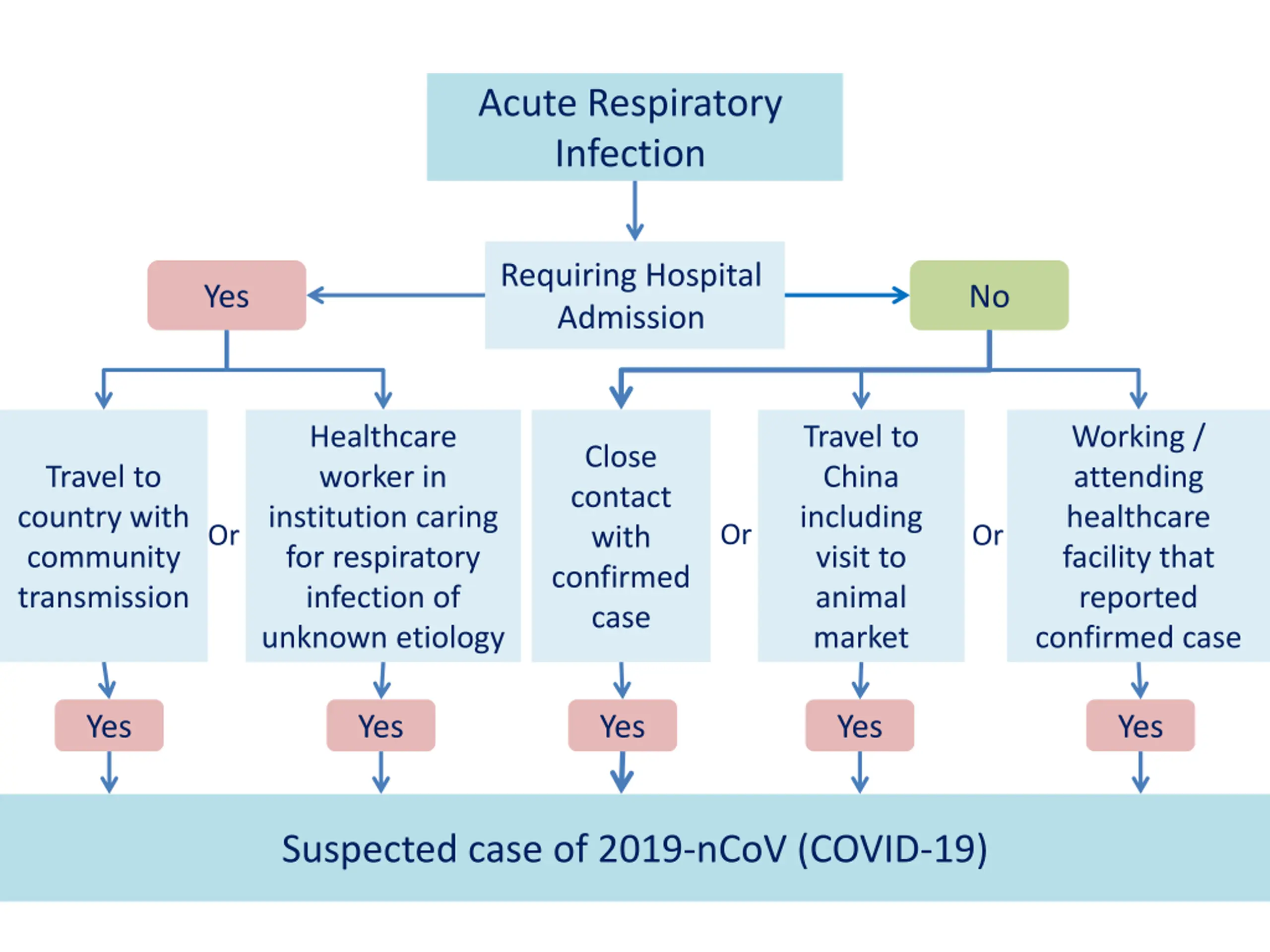 Acute Respiratory Infection Requiring Hospital Admission Yes No Healthcare worker in institution caring for respiratory infection of unknown etiology Travel to China including visit to animal market Working / attending healthcare facility that reported confirmed case Close contact with confirmed case Travel to country with community transmission Or Or Or Yes Yes Yes Yes Yes Suspected case of 2019-nCoV (COVID-19)
