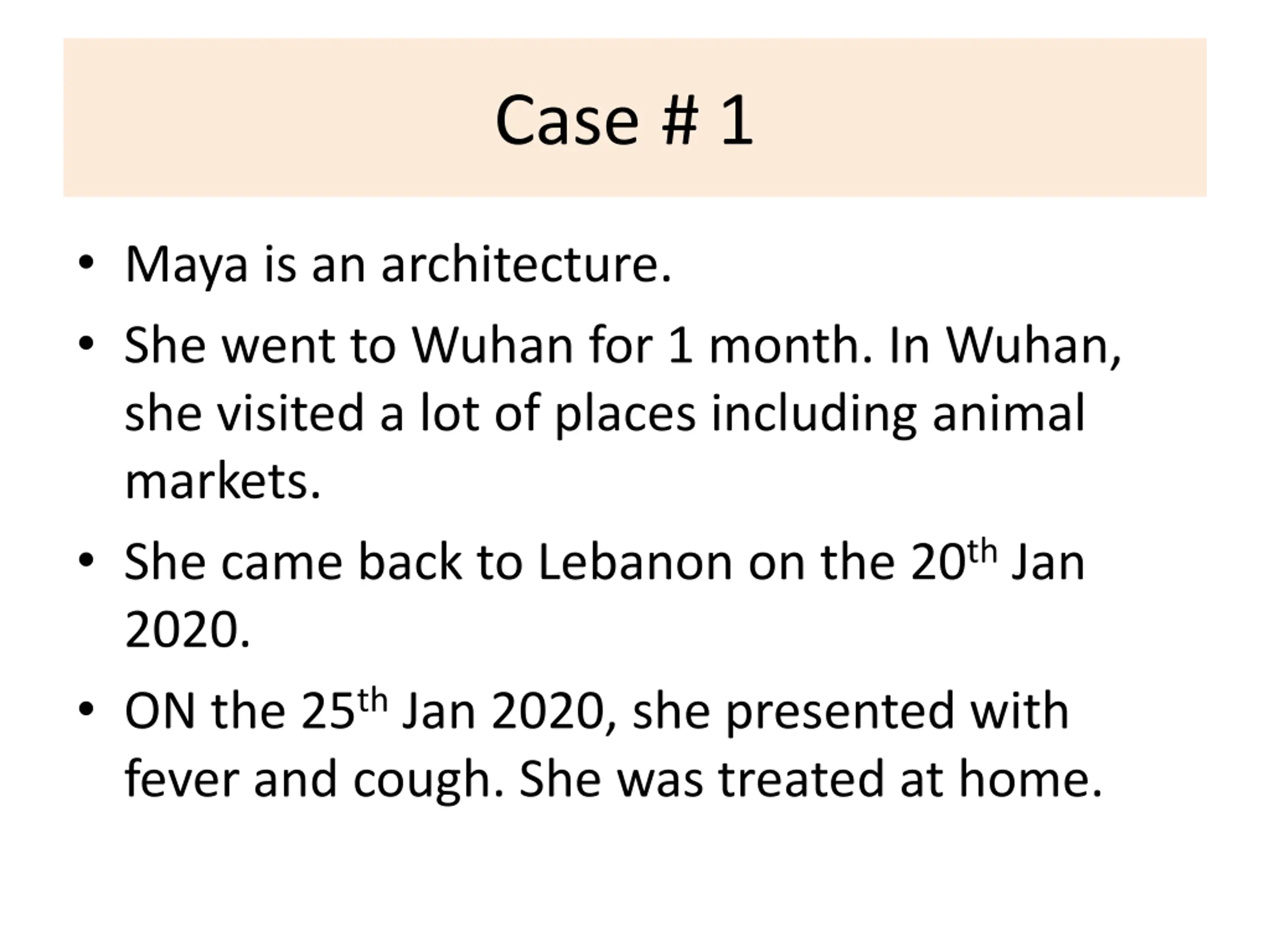 Case # 1 Maya is an architecture. She went to Wuhan for 1 month. In Wuhan, she visited a lot of places including animal markets. She came back to Lebanon on the 20th Jan 2020. ON the 25th Jan 2020, she presented with fever and cough. She was treated at home.