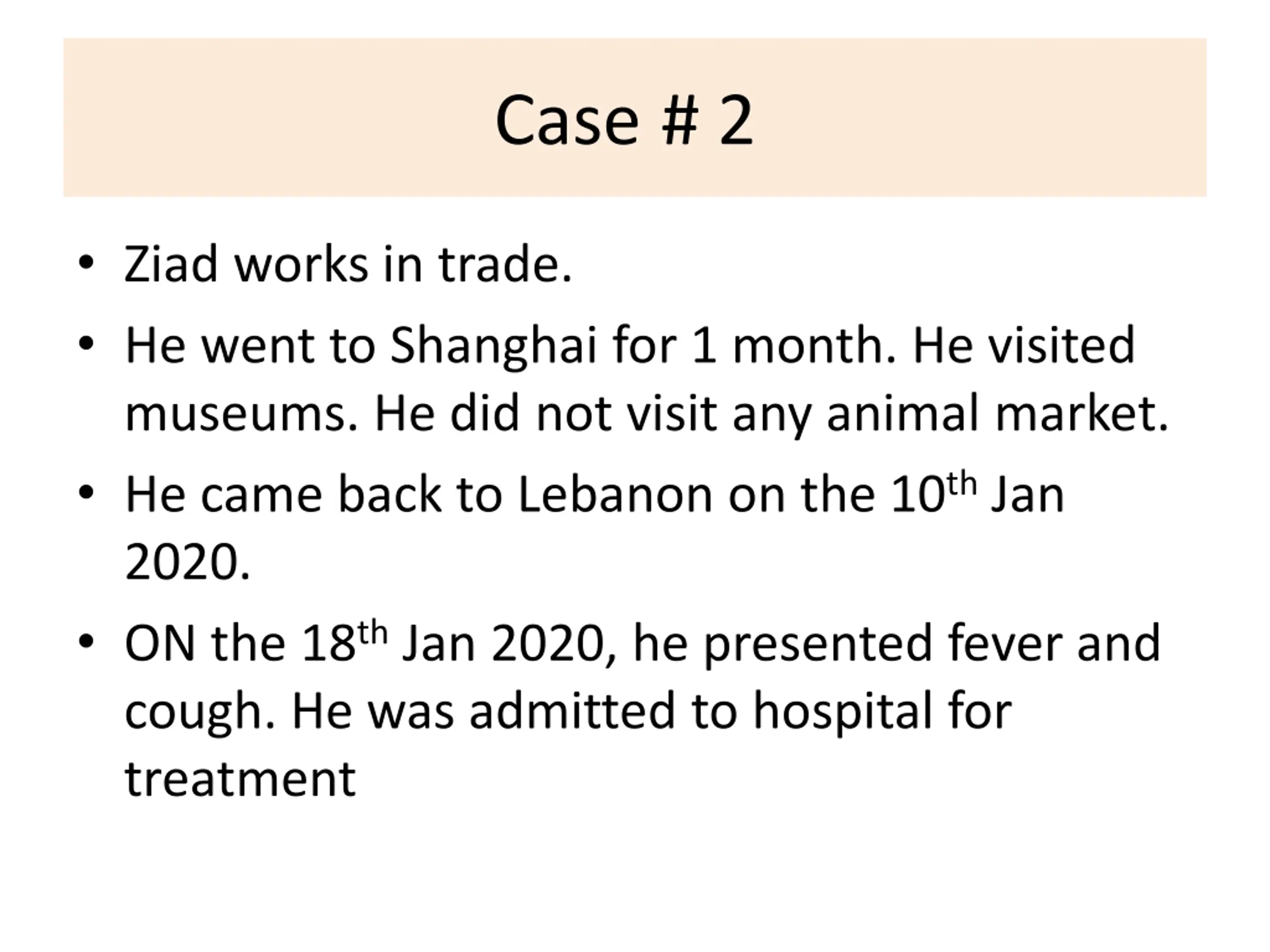 Case # 2 Ziad works in trade. He went to Shanghai for 1 month. He visited museums. He did not visit any animal market. He came back to Lebanon on the 10th Jan 2020. ON the 18th Jan 2020, he presented fever and cough. He was admitted to hospital for treatment