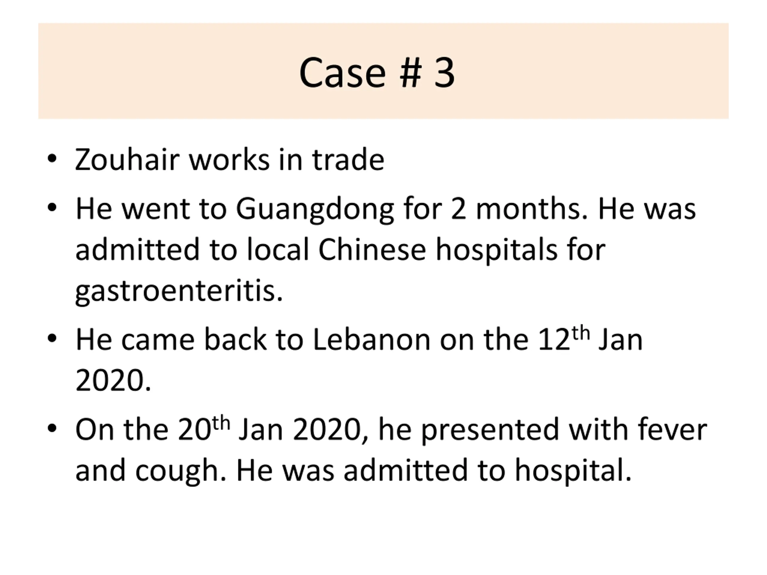 Case # 3 Zouhair works in trade He went to Guangdong for 2 months. He was admitted to local Chinese hospitals for gastroenteritis. He came back to Lebanon on the 12th Jan 2020. On the 20th Jan 2020, he presented with fever and cough. He was admitted to hospital.