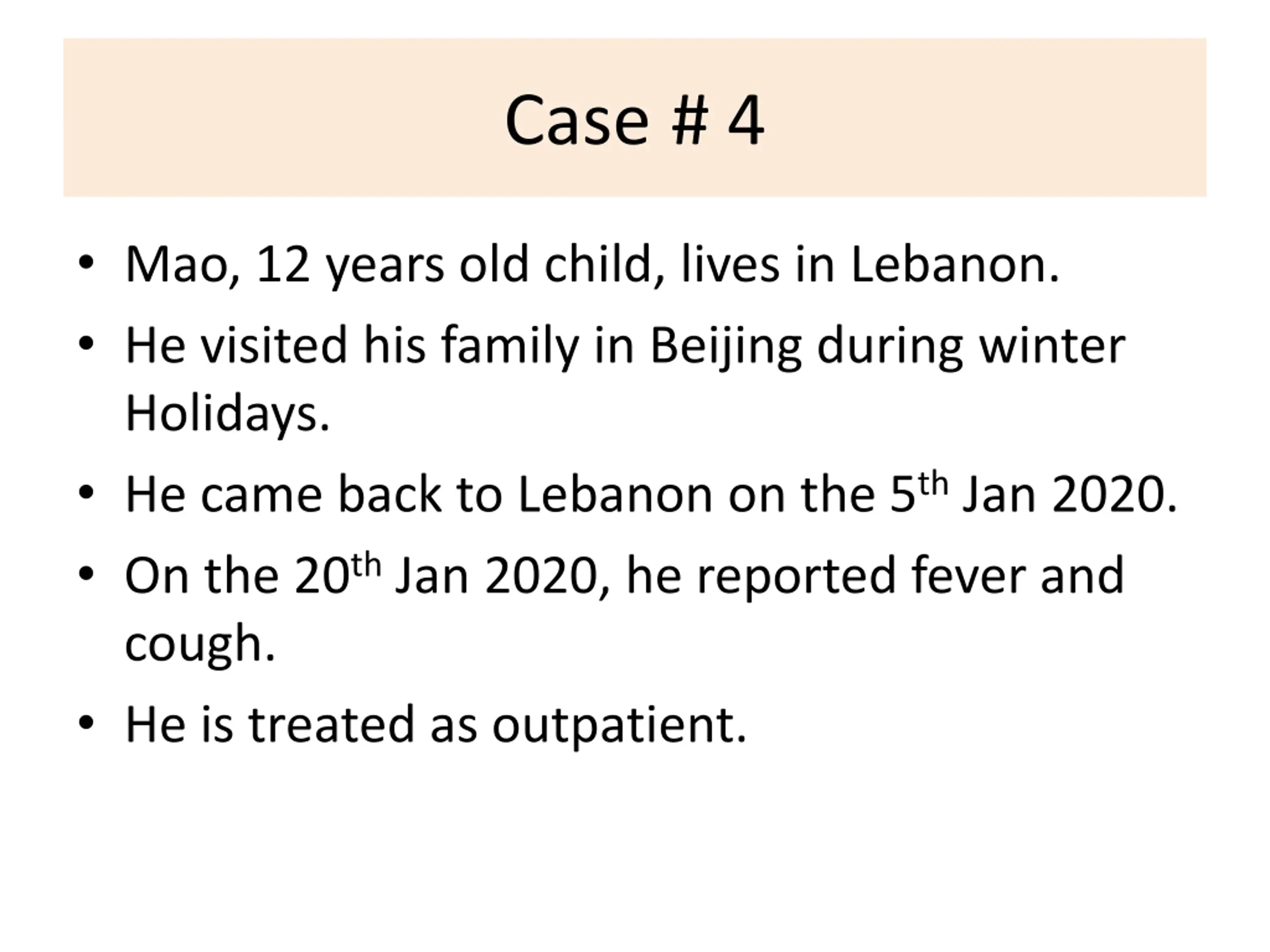 Case # 4 Mao, 12 years old child, lives in Lebanon. He visited his family in Beijing during winter Holidays. He came back to Lebanon on the 5th Jan 2020. On the 20th Jan 2020, he reported fever and cough. He is treated as outpatient.
