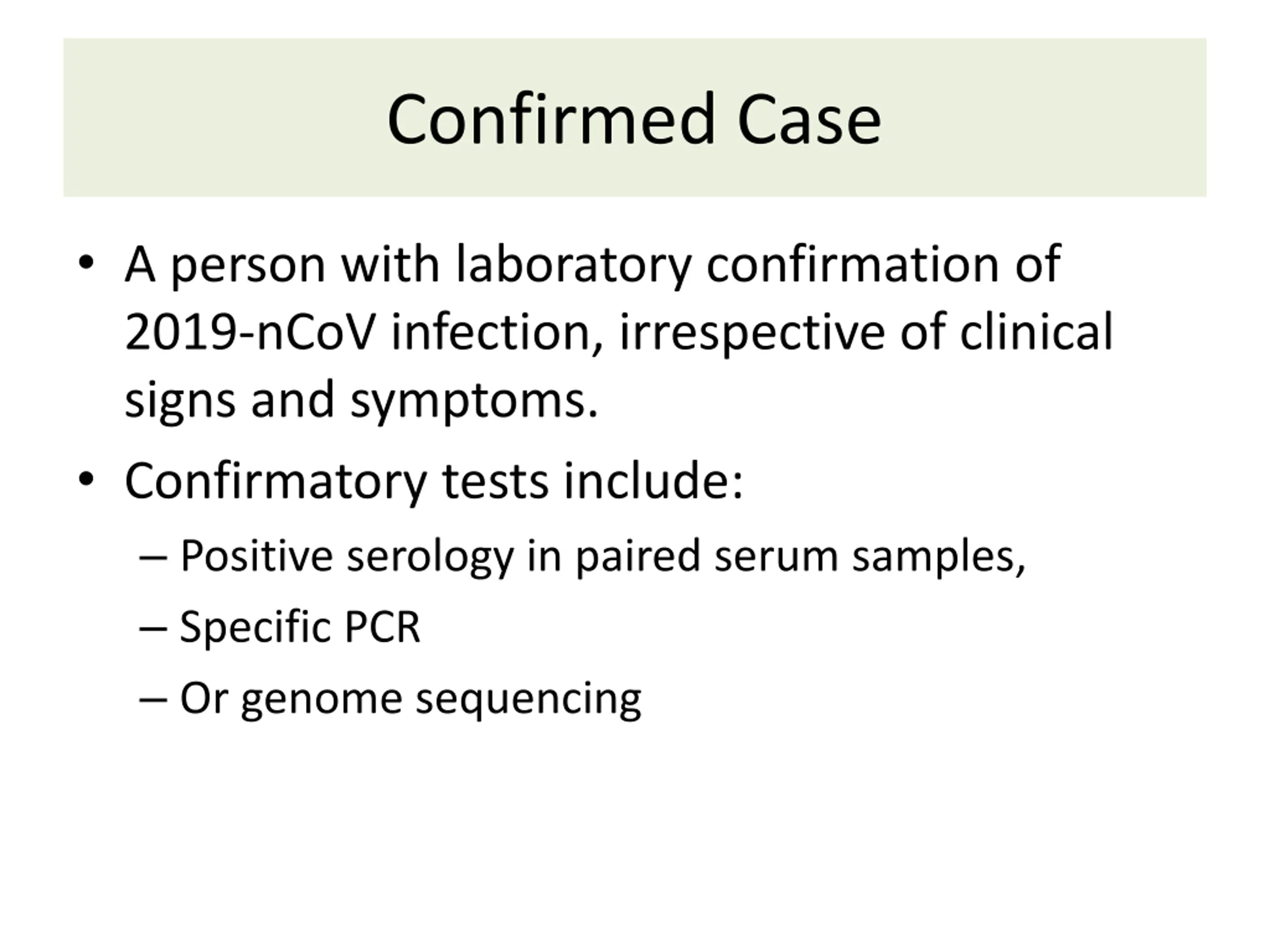 Confirmed Case A person with laboratory confirmation of 2019-nCoV infection, irrespective of clinical signs and symptoms. Confirmatory tests include: Positive serology in paired serum samples, Specific PCR Or genome sequencing