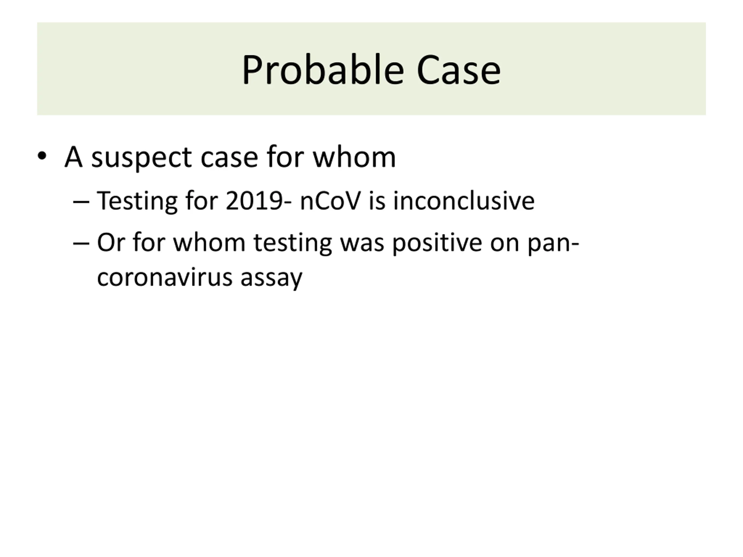 Probable Case A suspect case for whom Testing for 2019- nCoV is inconclusive Or for whom testing was positive on pan- coronavirus assay