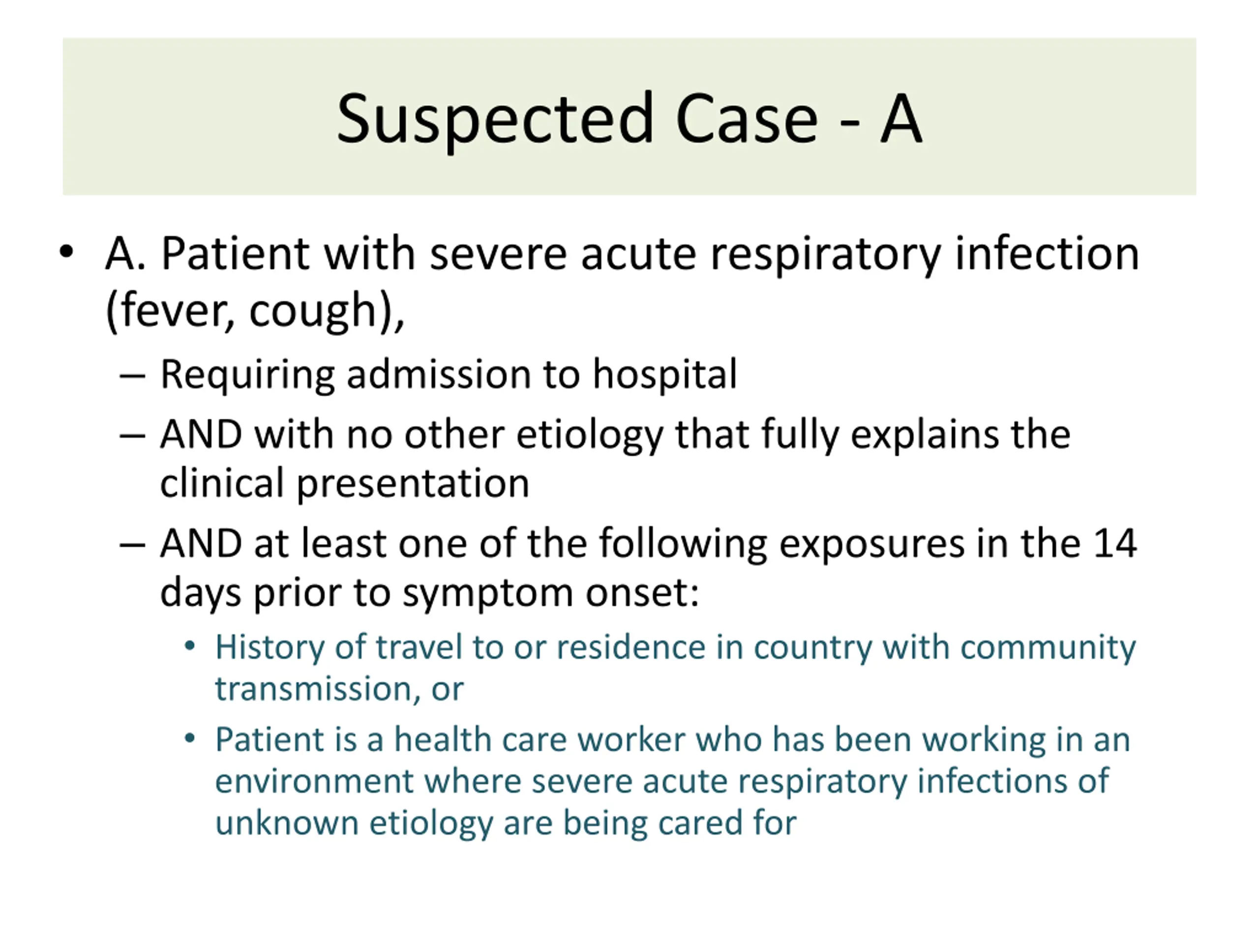 Suspected Case - A A. Patient with severe acute respiratory infection (fever, cough), Requiring admission to hospital AND with no other etiology that fully explains the clinical presentation AND at least one of the following exposures in the 14 days prior to symptom onset: History of travel to or residence in country with community transmission, or Patient is a health care worker who has been working in an environment where severe acute respiratory infections of unknown etiology are being cared for