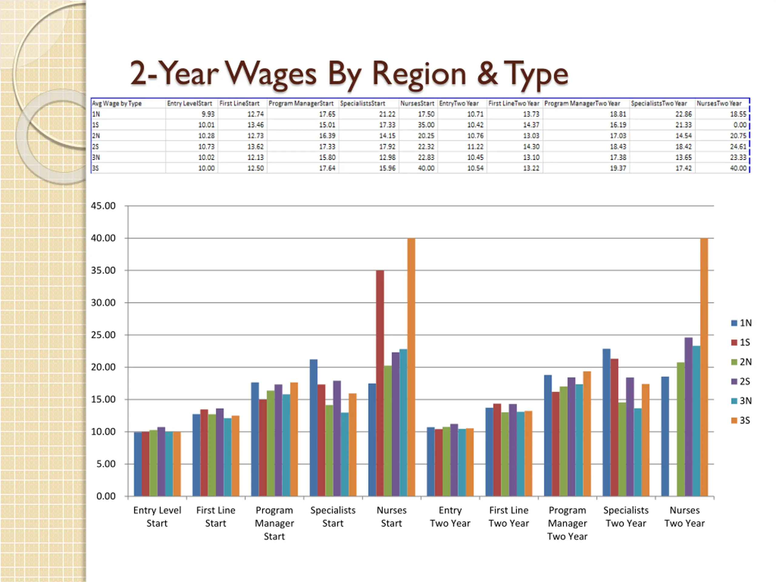 2-Year Wages By Region & Type 45.00 40.00 35.00 30.00 1N 25.00 1S 2N 20.00 2S 15.00 3N 3S 10.00 5.00 0.00 Entry Level Start First Line Start Program Manager Start Specialists Start Nurses Start Entry Two Year First Line Two Year Program Manager Two Year Specialists Two Year Nurses Two Year