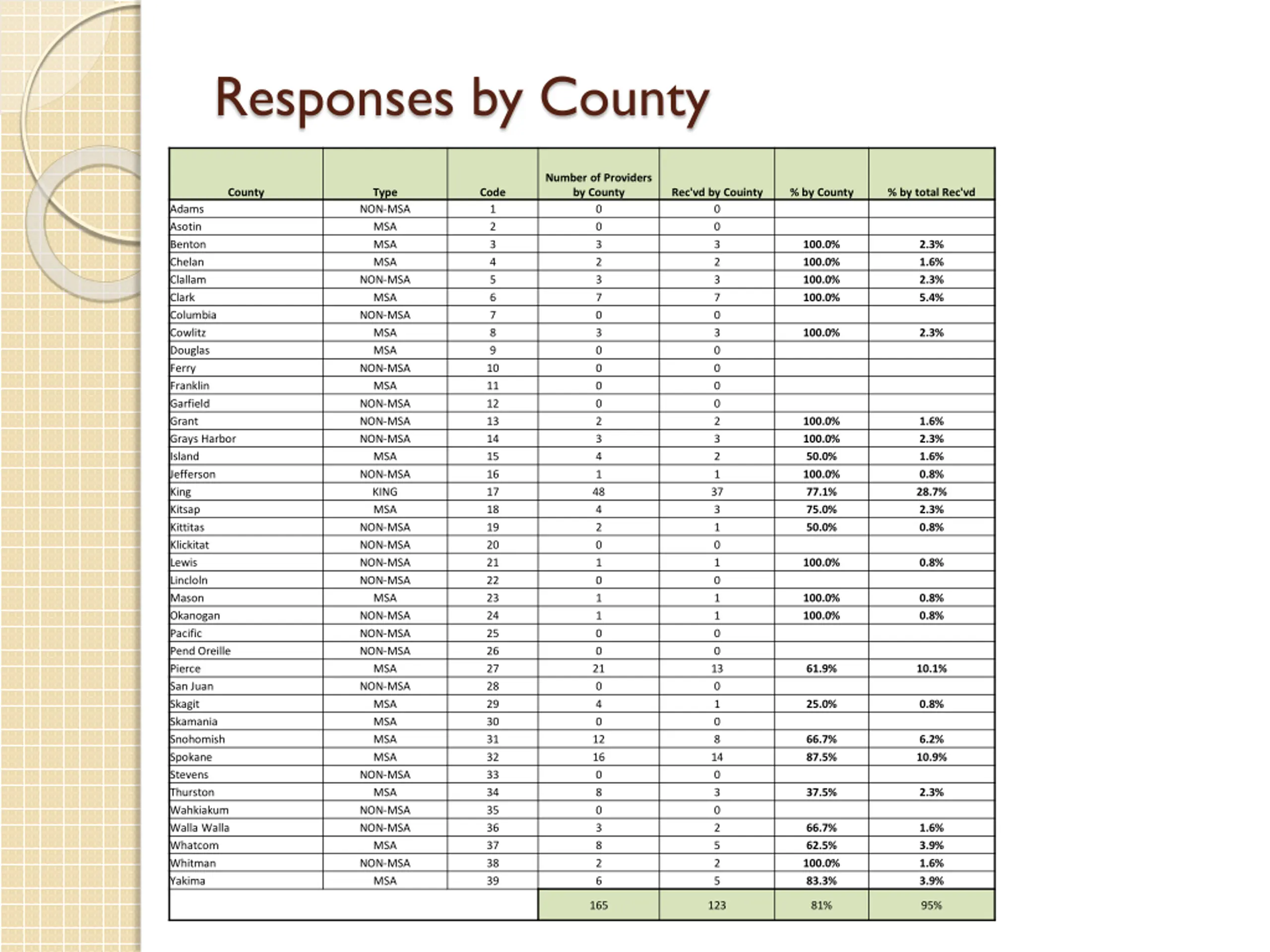 Responses by County Number of Providers by County 0 0 3 2 3 7 0 3 0 0 0 0 2 3 4 1 48 4 2 0 1 0 1 1 0 0 21 0 4 0 12 16 0 8 0 3 8 2 6 County Type Code 1 2 3 4 5 6 7 8 9 10 11 12 13 14 15 16 17 18 19 20 21 22 23 24 25 26 27 28 29 30 31 32 33 34 35 36 37 38 39 Rec'vd by Couinty 0 0 3 2 3 7 0 3 0 0 0 0 2 3 2 1 37 3 1 0 1 0 1 1 0 0 13 0 1 0 8 14 0 3 0 2 5 2 5 % by County % by total Rec'vd Adams Asotin Benton Chelan Clallam Clark Columbia Cowlitz Douglas Ferry Franklin Garfield Grant Grays Harbor Island Jefferson King Kitsap Kittitas Klickitat Lewis Lincloln Mason Okanogan Pacific Pend Oreille Pierce San Juan Skagit Skamania Snohomish Spokane Stevens Thurston Wahkiakum Walla Walla Whatcom Whitman Yakima NON-MSA MSA MSA MSA NON-MSA MSA NON-MSA MSA MSA NON-MSA MSA NON-MSA NON-MSA NON-MSA MSA NON-MSA KING MSA NON-MSA NON-MSA NON-MSA NON-MSA MSA NON-MSA NON-MSA NON-MSA MSA NON-MSA MSA MSA MSA MSA NON-MSA MSA NON-MSA NON-MSA MSA NON-MSA MSA 100.0% 100.0% 100.0% 100.0% 2.3% 1.6% 2.3% 5.4% 100.0% 2.3% 100.0% 100.0% 50.0% 100.0% 77.1% 75.0% 50.0% 1.6% 2.3% 1.6% 0.8% 28.7% 2.3% 0.8% 100.0% 0.8% 100.0% 100.0% 0.8% 0.8% 61.9% 10.1% 25.0% 0.8% 66.7% 87.5% 6.2% 10.9% 37.5% 2.3% 66.7% 62.5% 100.0% 83.3% 1.6% 3.9% 1.6% 3.9% 165 123 81% 95%
