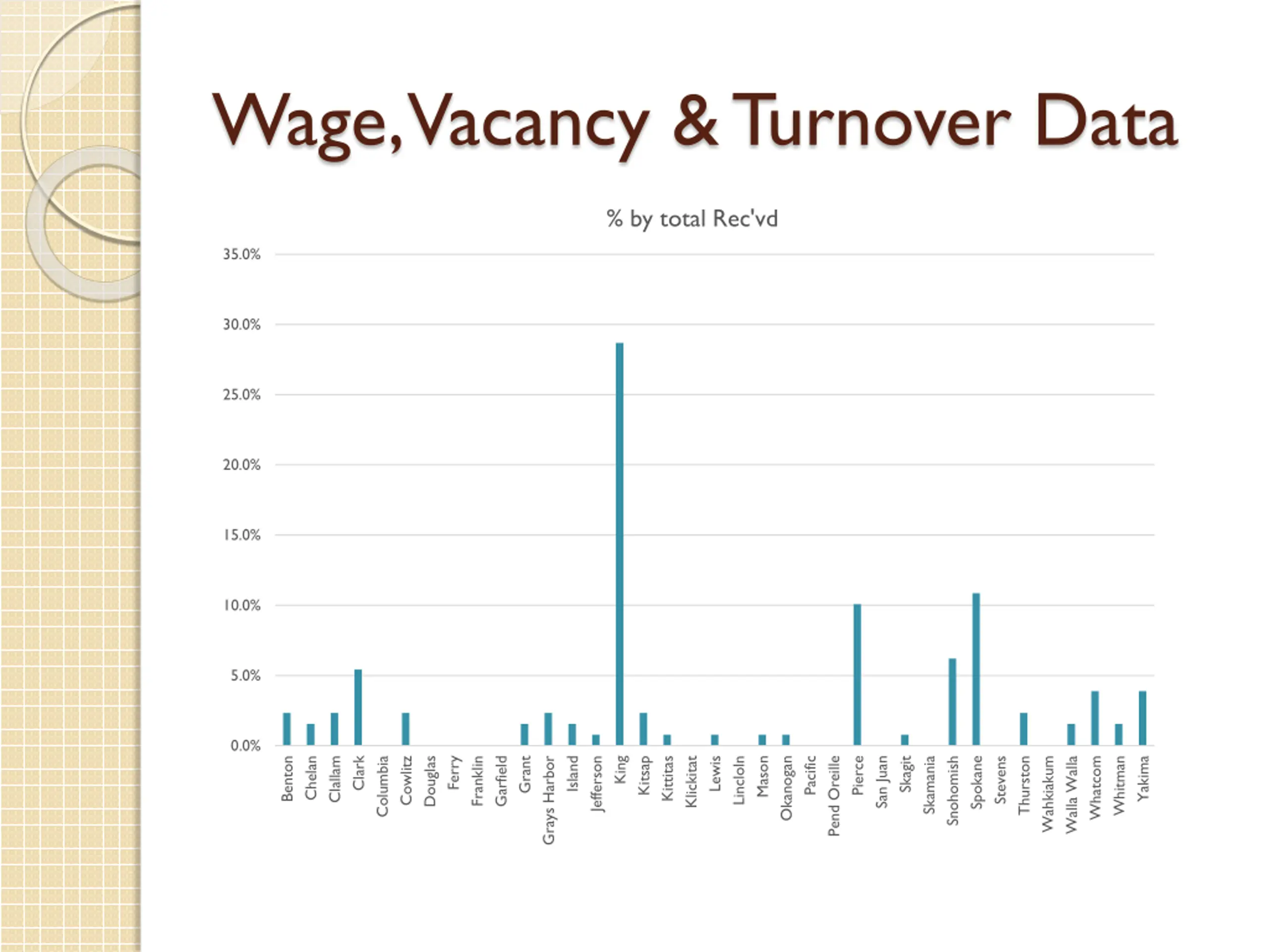 Wage, Vacancy & Turnover Data % by total Rec'vd 35.0% 30.0% 25.0% 20.0% 15.0% 10.0% 5.0% 0.0% Ferry Island Okanogan Pend Oreille Spokane Douglas Pacific Yakima Grant Skagit Walla Walla Mason San Juan Benton Klickitat Lincloln Whatcom Chelan Garfield Kittitas Whitman Grays Harbor King Lewis Clark Columbia Franklin Jefferson Skamania Cowlitz Pierce Snohomish Thurston Kitsap Clallam Stevens Wahkiakum