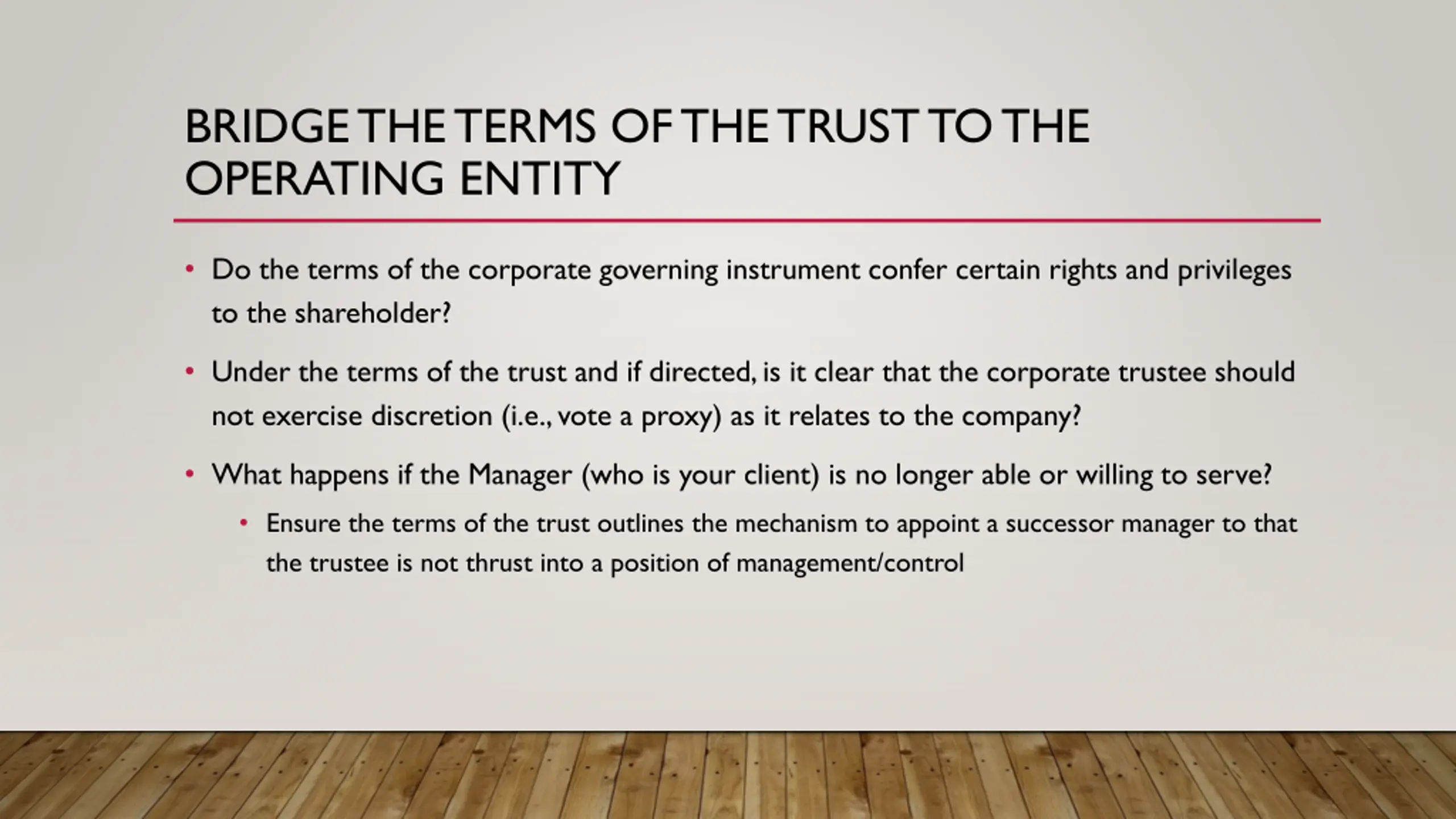 BRIDGE THE TERMS OF THE TRUST TO THE OPERATING ENTITY Do the terms of the corporate governing instrument confer certain rights and privileges to the shareholder? Under the terms of the trust and if directed, is it clear that the corporate trustee should not exercise discretion (i.e., vote a proxy) as it relates to the company? What happens if the Manager (who is your client) is no longer able or willing to serve? Ensure the terms of the trust outlines the mechanism to appoint a successor manager to that the trustee is not thrust into a position of management/control
