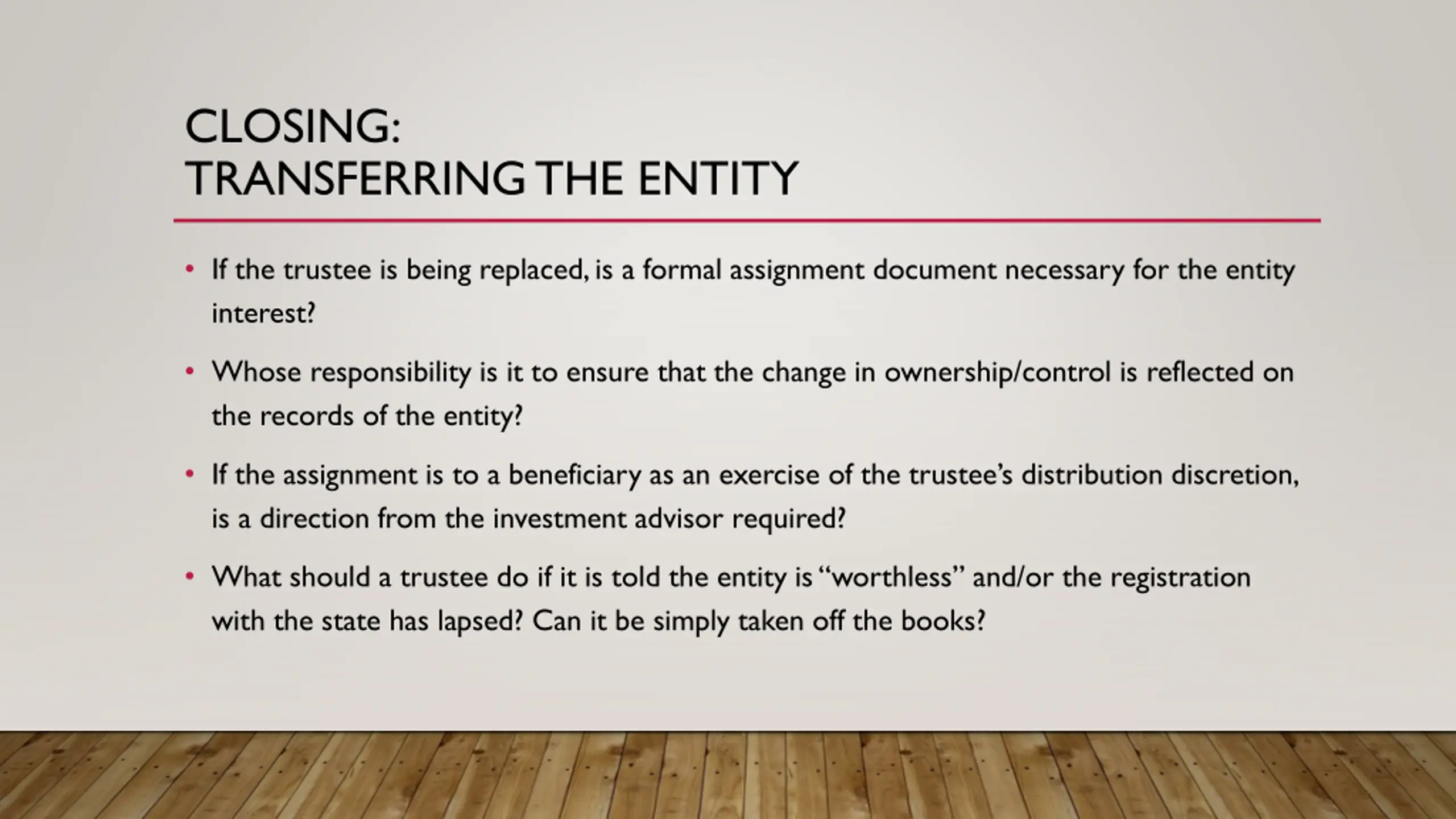 CLOSING: TRANSFERRING THE ENTITY If the trustee is being replaced, is a formal assignment document necessary for the entity interest? Whose responsibility is it to ensure that the change in ownership/control is reflected on the records of the entity? If the assignment is to a beneficiary as an exercise of the trustee s distribution discretion, is a direction from the investment advisor required? What should a trustee do if it is told the entity is worthless and/or the registration with the state has lapsed? Can it be simply taken off the books?
