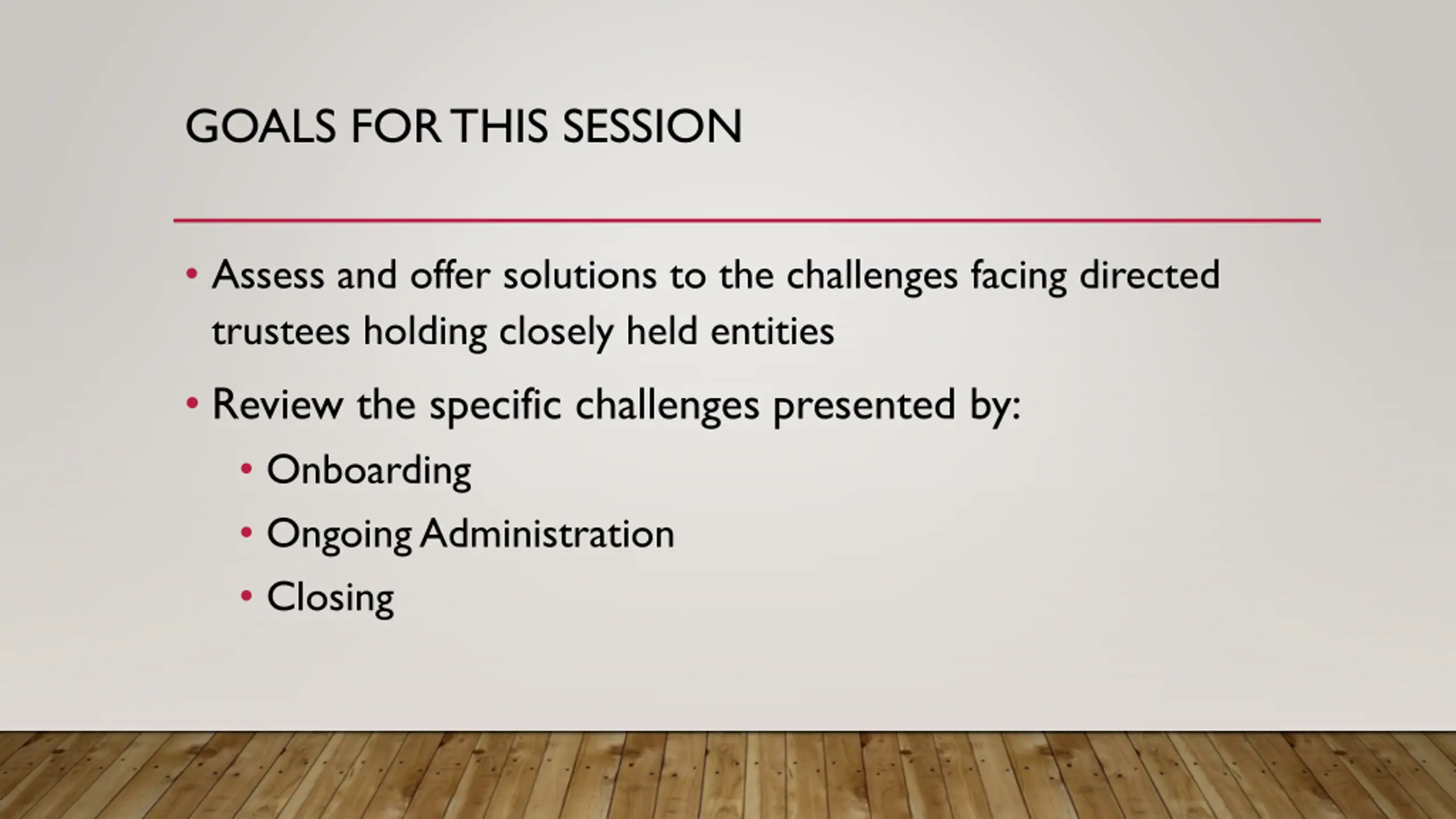 GOALS FOR THIS SESSION Assess and offer solutions to the challenges facing directed trustees holding closely held entities Review the specific challenges presented by: Onboarding Ongoing Administration Closing
