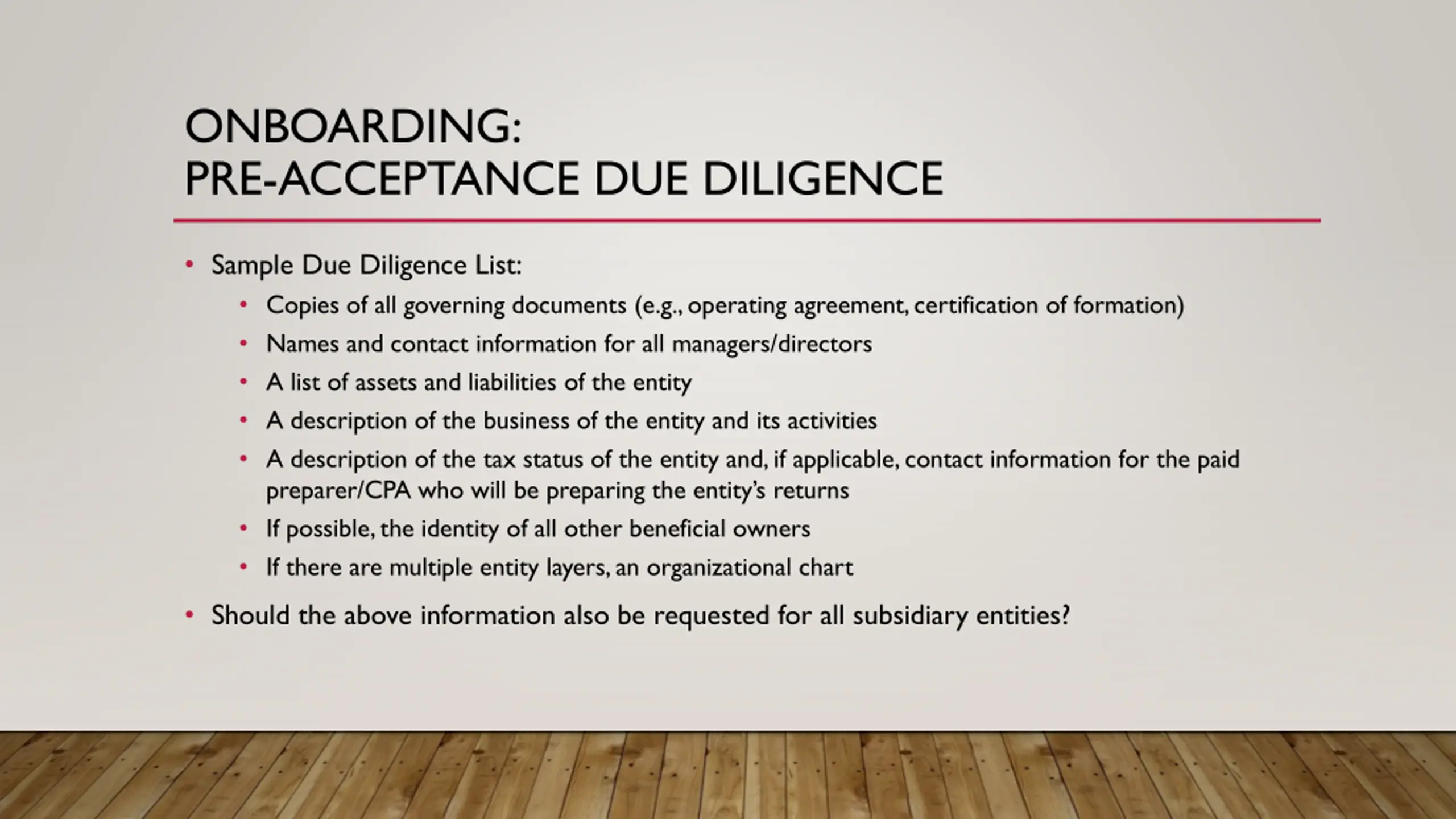 ONBOARDING: PRE-ACCEPTANCE DUE DILIGENCE Sample Due Diligence List: Copies of all governing documents (e.g., operating agreement, certification of formation) Names and contact information for all managers/directors A list of assets and liabilities of the entity A description of the business of the entity and its activities A description of the tax status of the entity and, if applicable, contact information for the paid preparer/CPA who will be preparing the entity s returns If possible, the identity of all other beneficial owners If there are multiple entity layers, an organizational chart Should the above information also be requested for all subsidiary entities?