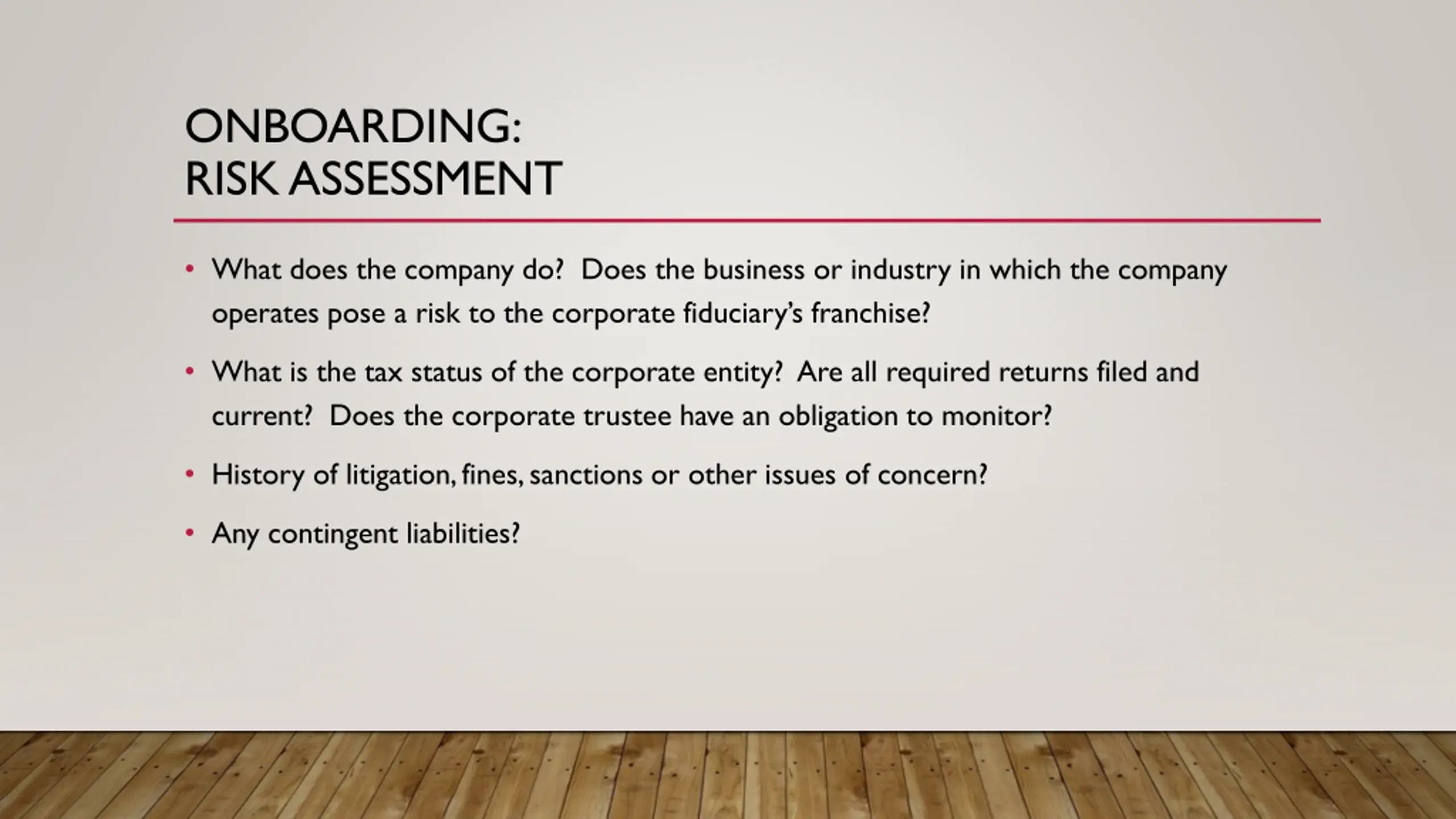 ONBOARDING: RISK ASSESSMENT What does the company do? Does the business or industry in which the company operates pose a risk to the corporate fiduciary s franchise? What is the tax status of the corporate entity? Are all required returns filed and current? Does the corporate trustee have an obligation to monitor? History of litigation, fines, sanctions or other issues of concern? Any contingent liabilities?