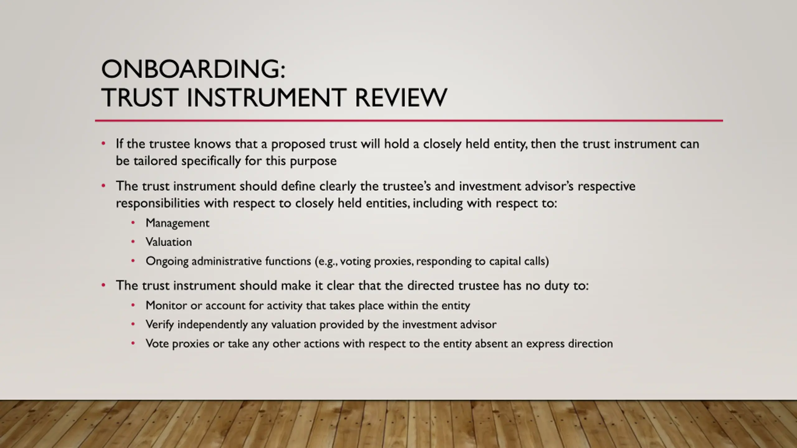 ONBOARDING: TRUST INSTRUMENT REVIEW If the trustee knows that a proposed trust will hold a closely held entity, then the trust instrument can be tailored specifically for this purpose The trust instrument should define clearly the trustee s and investment advisor s respective responsibilities with respect to closely held entities, including with respect to: Management Valuation Ongoing administrative functions (e.g., voting proxies, responding to capital calls) The trust instrument should make it clear that the directed trustee has no duty to: Monitor or account for activity that takes place within the entity Verify independently any valuation provided by the investment advisor Vote proxies or take any other actions with respect to the entity absent an express direction
