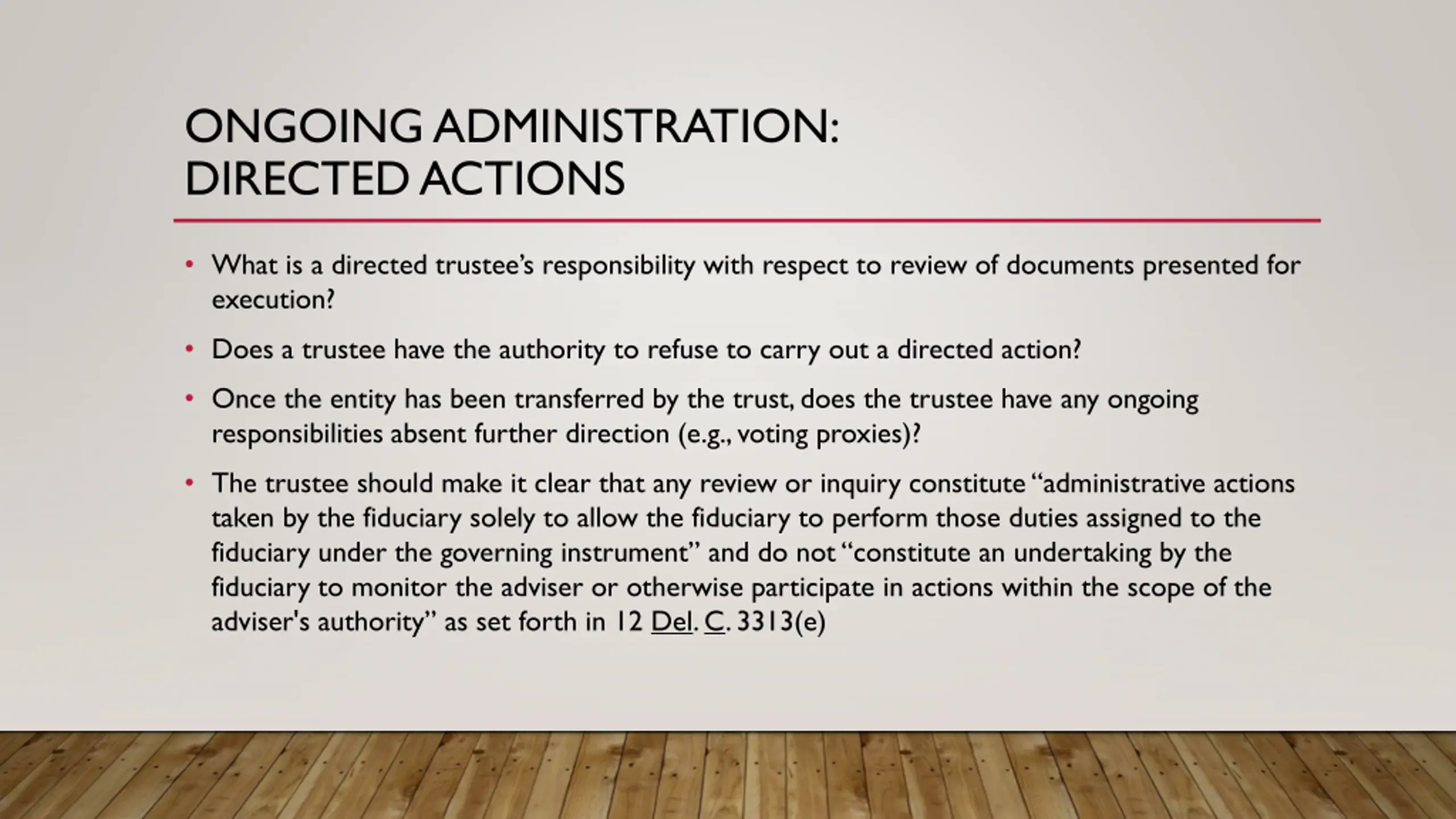 ONGOING ADMINISTRATION: DIRECTED ACTIONS What is a directed trustee s responsibility with respect to review of documents presented for execution? Does a trustee have the authority to refuse to carry out a directed action? Once the entity has been transferred by the trust, does the trustee have any ongoing responsibilities absent further direction (e.g., voting proxies)? The trustee should make it clear that any review or inquiry constitute administrative actions taken by the fiduciary solely to allow the fiduciary to perform those duties assigned to the fiduciary under the governing instrument and do not constitute an undertaking by the fiduciary to monitor the adviser or otherwise participate in actions within the scope of the adviser's authority as set forth in 12 Del. C. 3313(e)