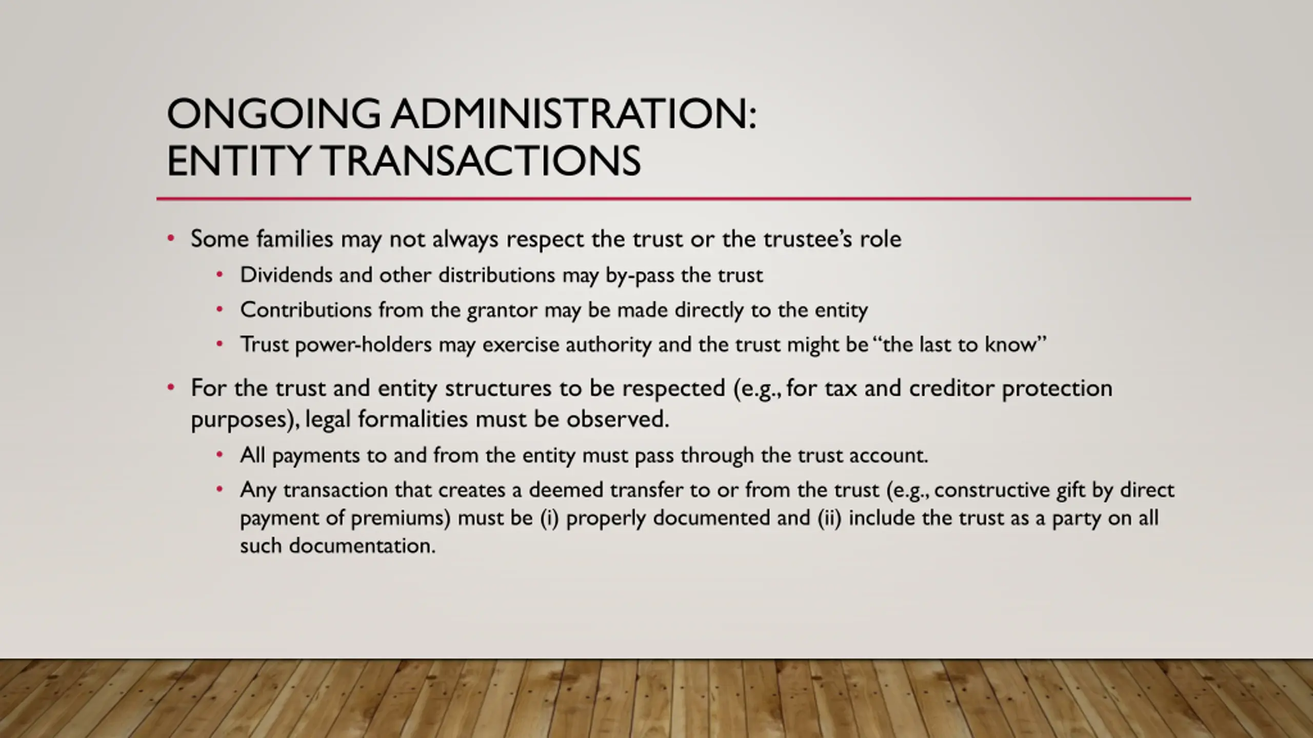 ONGOING ADMINISTRATION: ENTITY TRANSACTIONS Some families may not always respect the trust or the trustee s role Dividends and other distributions may by-pass the trust Contributions from the grantor may be made directly to the entity Trust power-holders may exercise authority and the trust might be the last to know For the trust and entity structures to be respected (e.g., for tax and creditor protection purposes), legal formalities must be observed. All payments to and from the entity must pass through the trust account. Any transaction that creates a deemed transfer to or from the trust (e.g., constructive gift by direct payment of premiums) must be (i) properly documented and (ii) include the trust as a party on all such documentation.