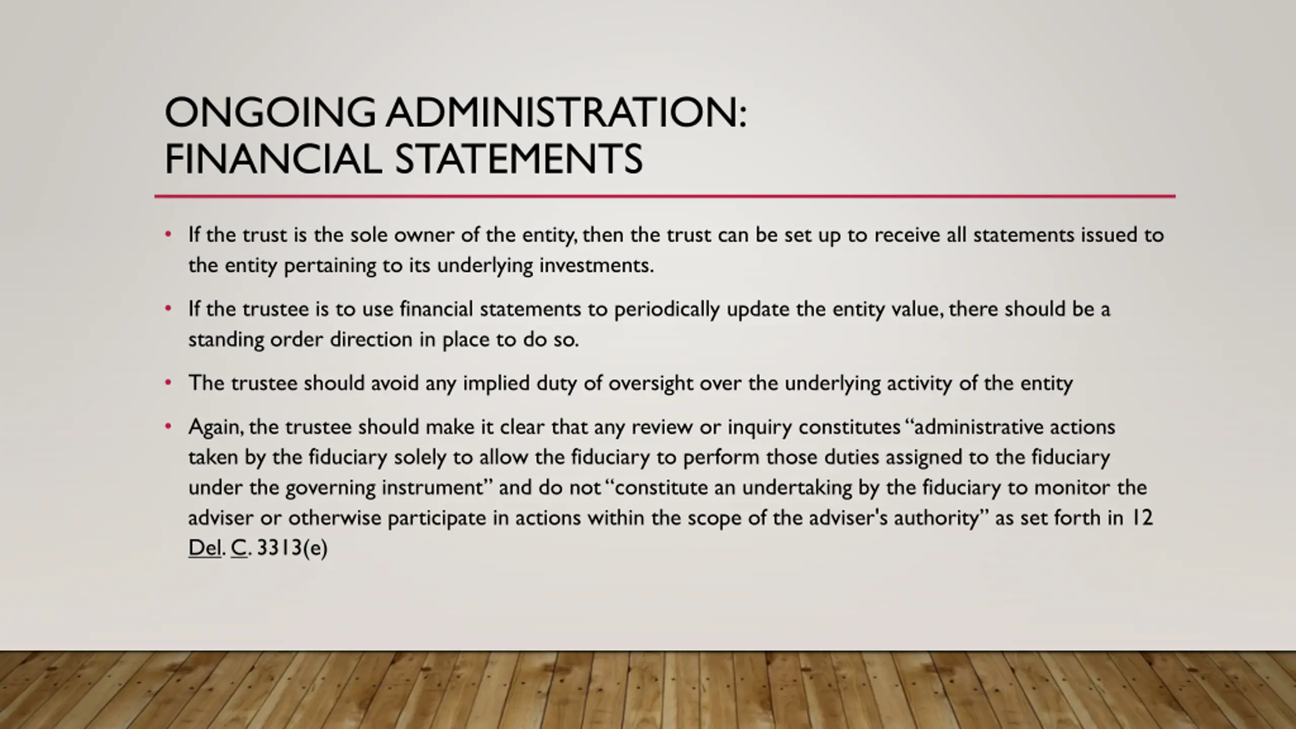 ONGOING ADMINISTRATION: FINANCIAL STATEMENTS If the trust is the sole owner of the entity, then the trust can be set up to receive all statements issued to the entity pertaining to its underlying investments. If the trustee is to use financial statements to periodically update the entity value, there should be a standing order direction in place to do so. The trustee should avoid any implied duty of oversight over the underlying activity of the entity Again, the trustee should make it clear that any review or inquiry constitutes administrative actions taken by the fiduciary solely to allow the fiduciary to perform those duties assigned to the fiduciary under the governing instrument and do not constitute an undertaking by the fiduciary to monitor the adviser or otherwise participate in actions within the scope of the adviser's authority as set forth in 12 Del. C. 3313(e)