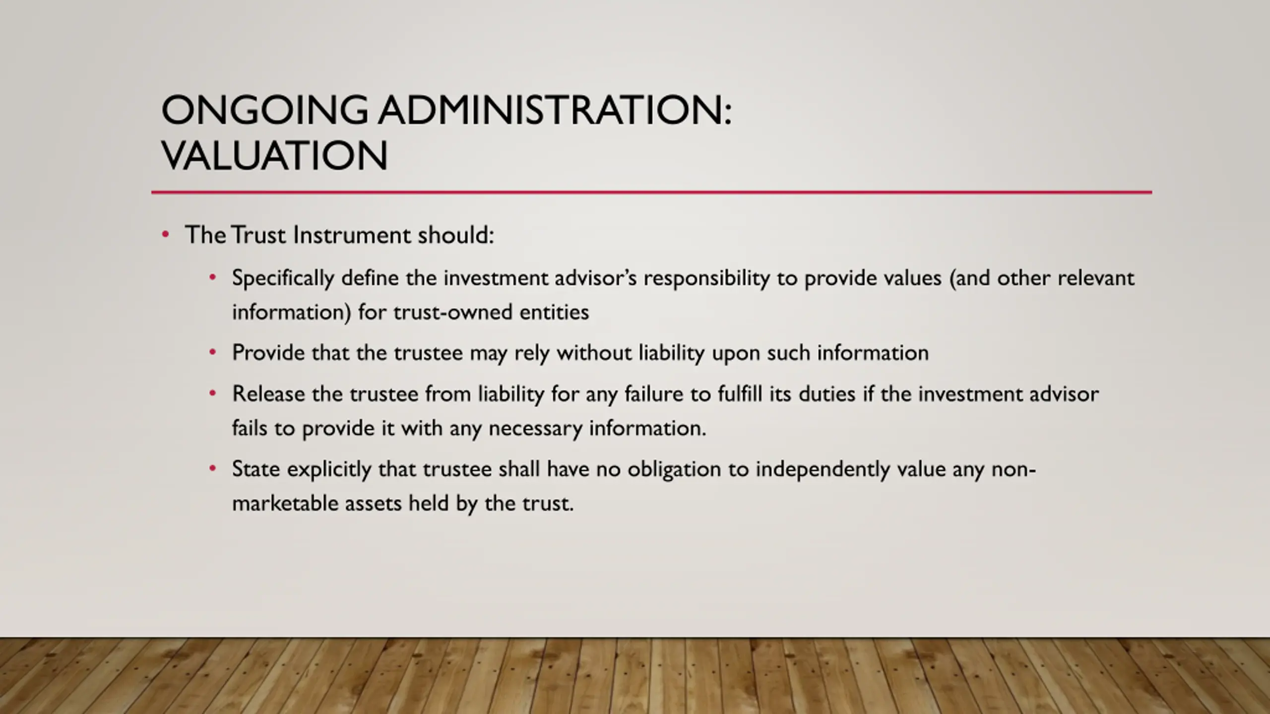 ONGOING ADMINISTRATION: VALUATION The Trust Instrument should: Specifically define the investment advisor s responsibility to provide values (and other relevant information) for trust-owned entities Provide that the trustee may rely without liability upon such information Release the trustee from liability for any failure to fulfill its duties if the investment advisor fails to provide it with any necessary information. State explicitly that trustee shall have no obligation to independently value any non- marketable assets held by the trust.