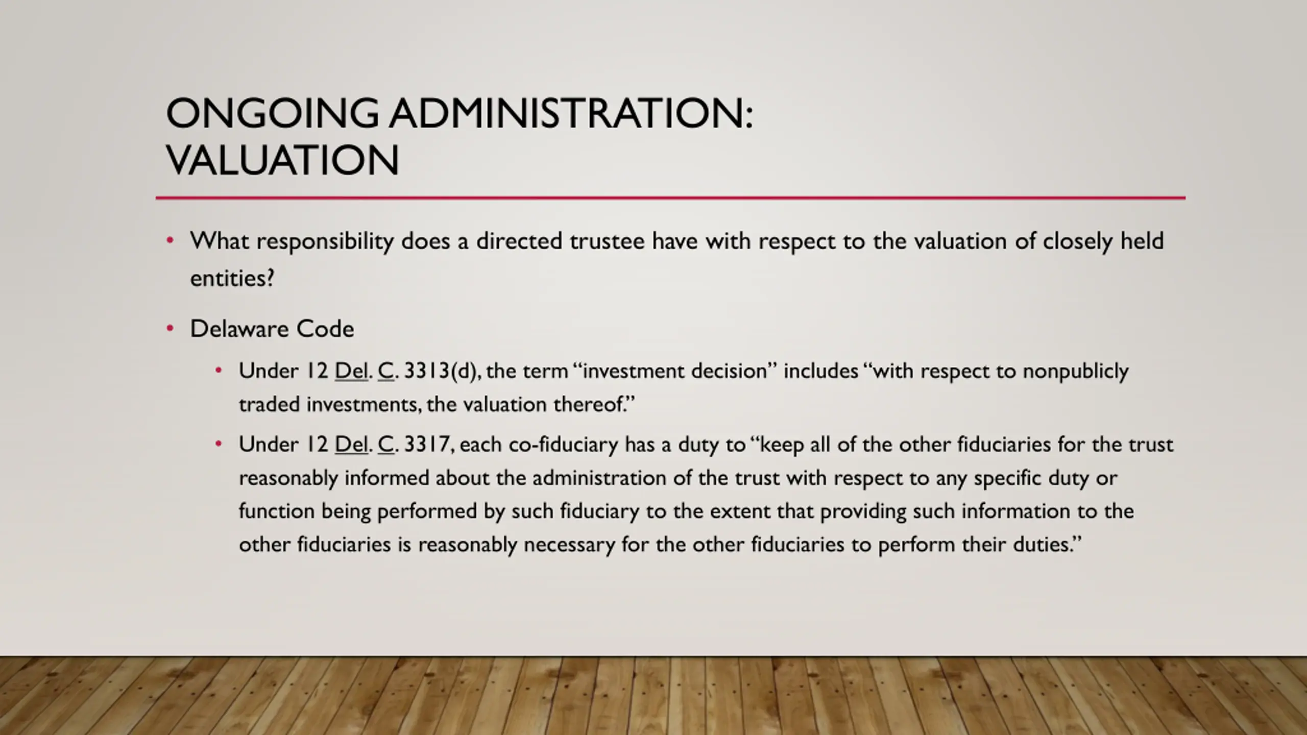 ONGOING ADMINISTRATION: VALUATION What responsibility does a directed trustee have with respect to the valuation of closely held entities? Delaware Code Under 12 Del. C. 3313(d), the term investment decision includes with respect to nonpublicly traded investments, the valuation thereof. Under 12 Del. C. 3317, each co-fiduciary has a duty to keep all of the other fiduciaries for the trust reasonably informed about the administration of the trust with respect to any specific duty or function being performed by such fiduciary to the extent that providing such information to the other fiduciaries is reasonably necessary for the other fiduciaries to perform their duties.