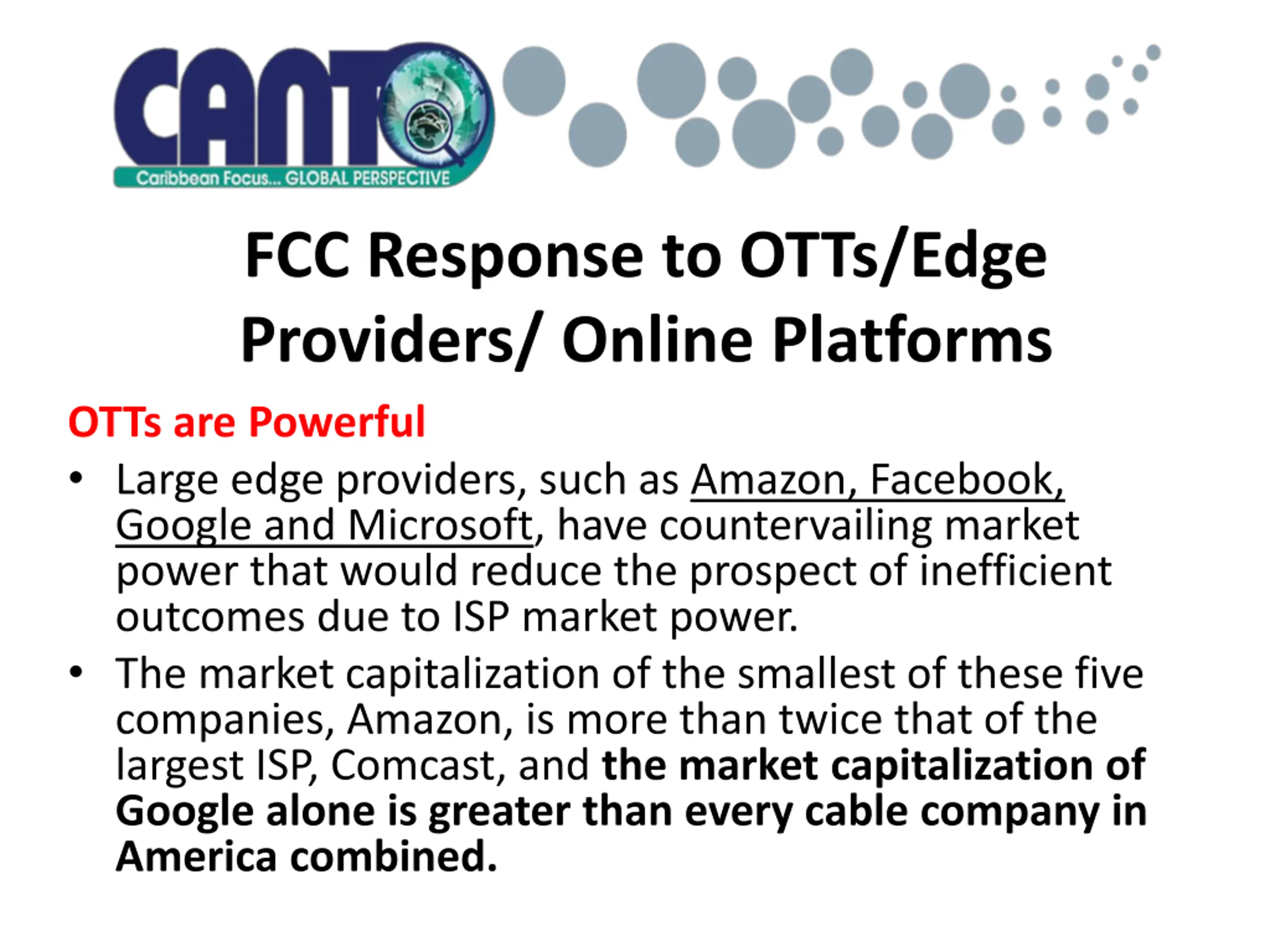 FCC Response to OTTs/Edge Providers/ Online Platforms OTTs are Powerful Large edge providers, such as Amazon, Facebook, Google and Microsoft, have countervailing market power that would reduce the prospect of inefficient outcomes due to ISP market power. The market capitalization of the smallest of these five companies, Amazon, is more than twice that of the largest ISP, Comcast, and the market capitalization of Google alone is greater than every cable company in America combined.