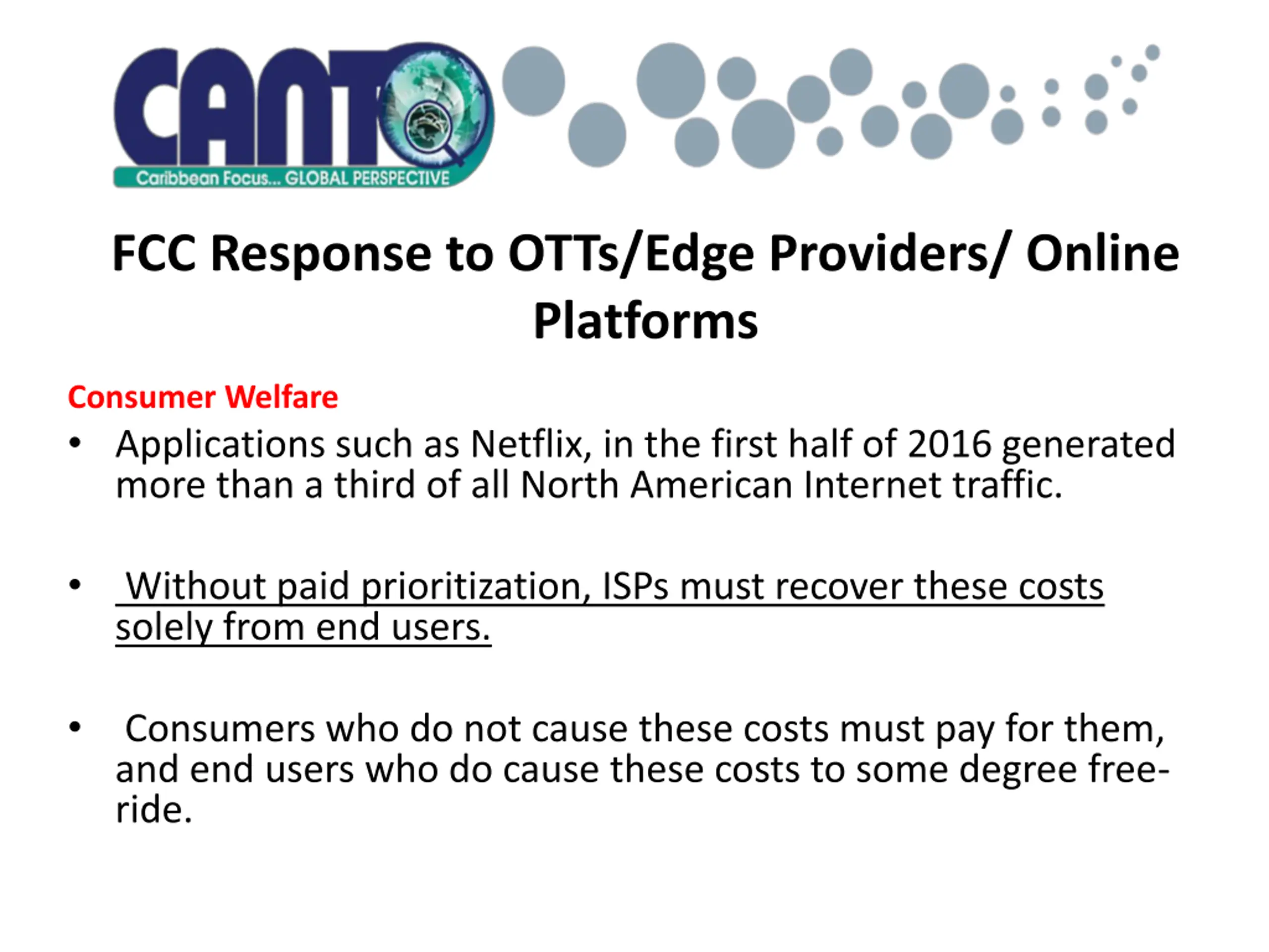 FCC Response to OTTs/Edge Providers/ Online Platforms Consumer Welfare Applications such as Netflix, in the first half of 2016 generated more than a third of all North American Internet traffic. Without paid prioritization, ISPs must recover these costs solely from end users. Consumers who do not cause these costs must pay for them, and end users who do cause these costs to some degree free- ride.