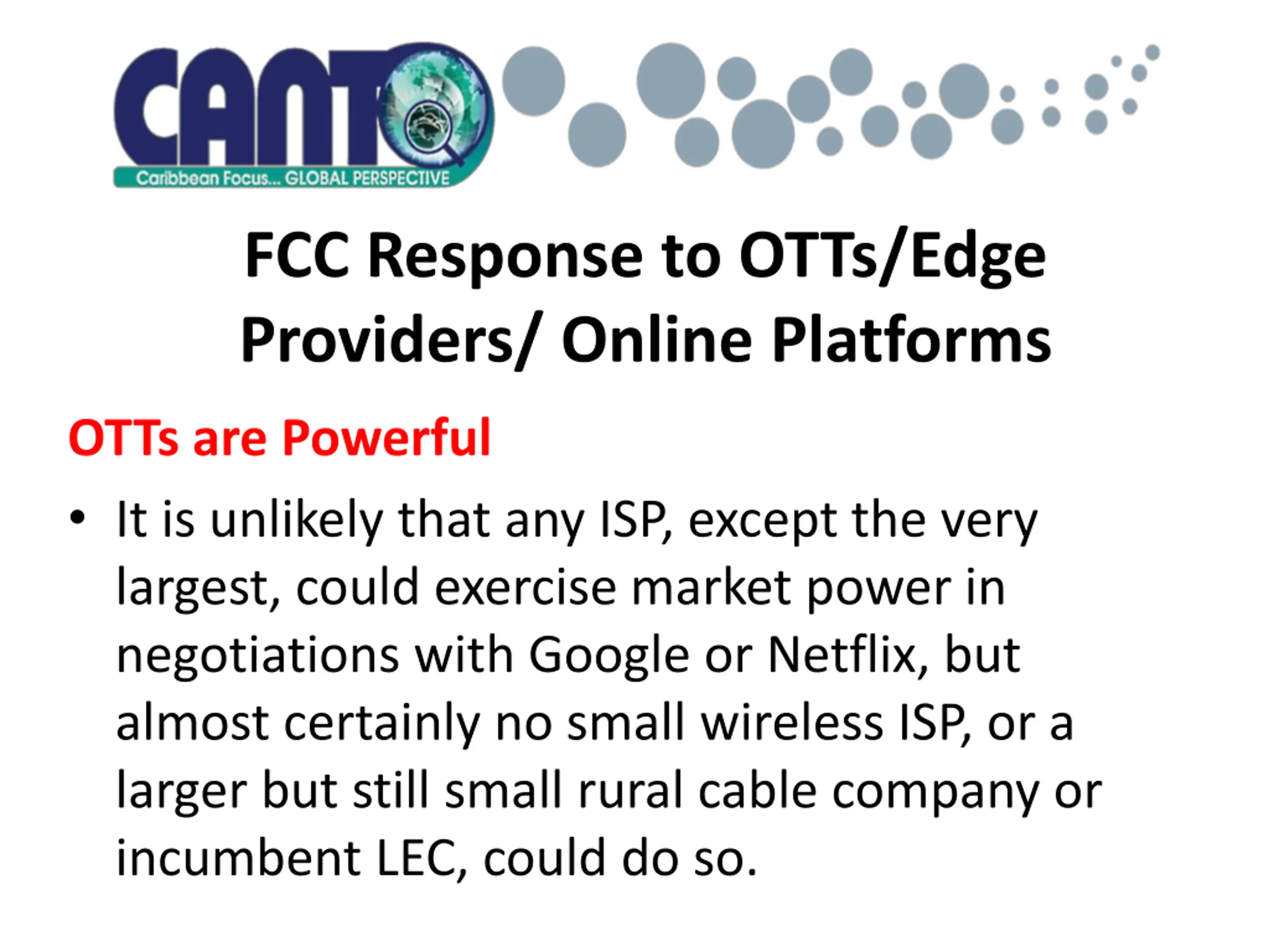 FCC Response to OTTs/Edge Providers/ Online Platforms OTTs are Powerful It is unlikely that any ISP, except the very largest, could exercise market power in negotiations with Google or Netflix, but almost certainly no small wireless ISP, or a larger but still small rural cable company or incumbent LEC, could do so.