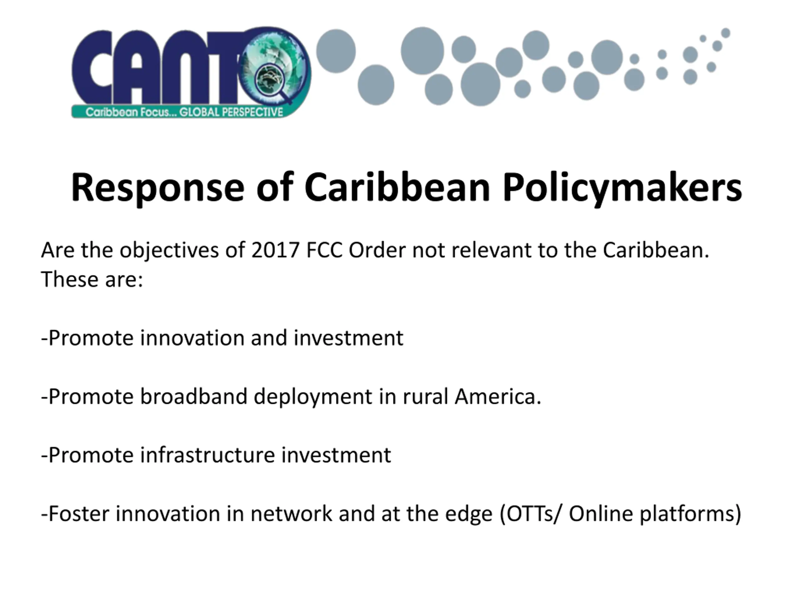 Response of Caribbean Policymakers Are the objectives of 2017 FCC Order not relevant to the Caribbean. These are: -Promote innovation and investment -Promote broadband deployment in rural America. -Promote infrastructure investment -Foster innovation in network and at the edge (OTTs/ Online platforms)