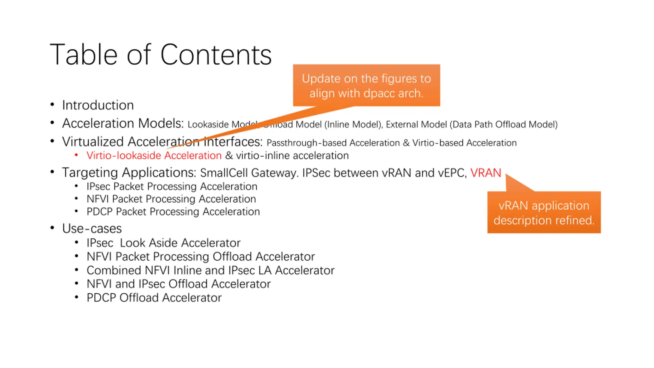 Table of Contents Update on the figures to align with dpacc arch. Introduction Acceleration Models: Lookaside Model, Offload Model (Inline Model), External Model (Data Path Offload Model) Virtualized Acceleration Interfaces: Passthrough-based Acceleration & Virtio-based Acceleration Virtio-lookaside Acceleration & virtio-inline acceleration Targeting Applications: SmallCell Gateway. IPSec between vRAN and vEPC, VRAN IPsec Packet Processing Acceleration NFVI Packet Processing Acceleration PDCP Packet Processing Acceleration Use-cases IPsec Look Aside Accelerator NFVI Packet Processing Offload Accelerator Combined NFVI Inline and IPsec LA Accelerator NFVI and IPsec Offload Accelerator PDCP Offload Accelerator vRAN application description refined.