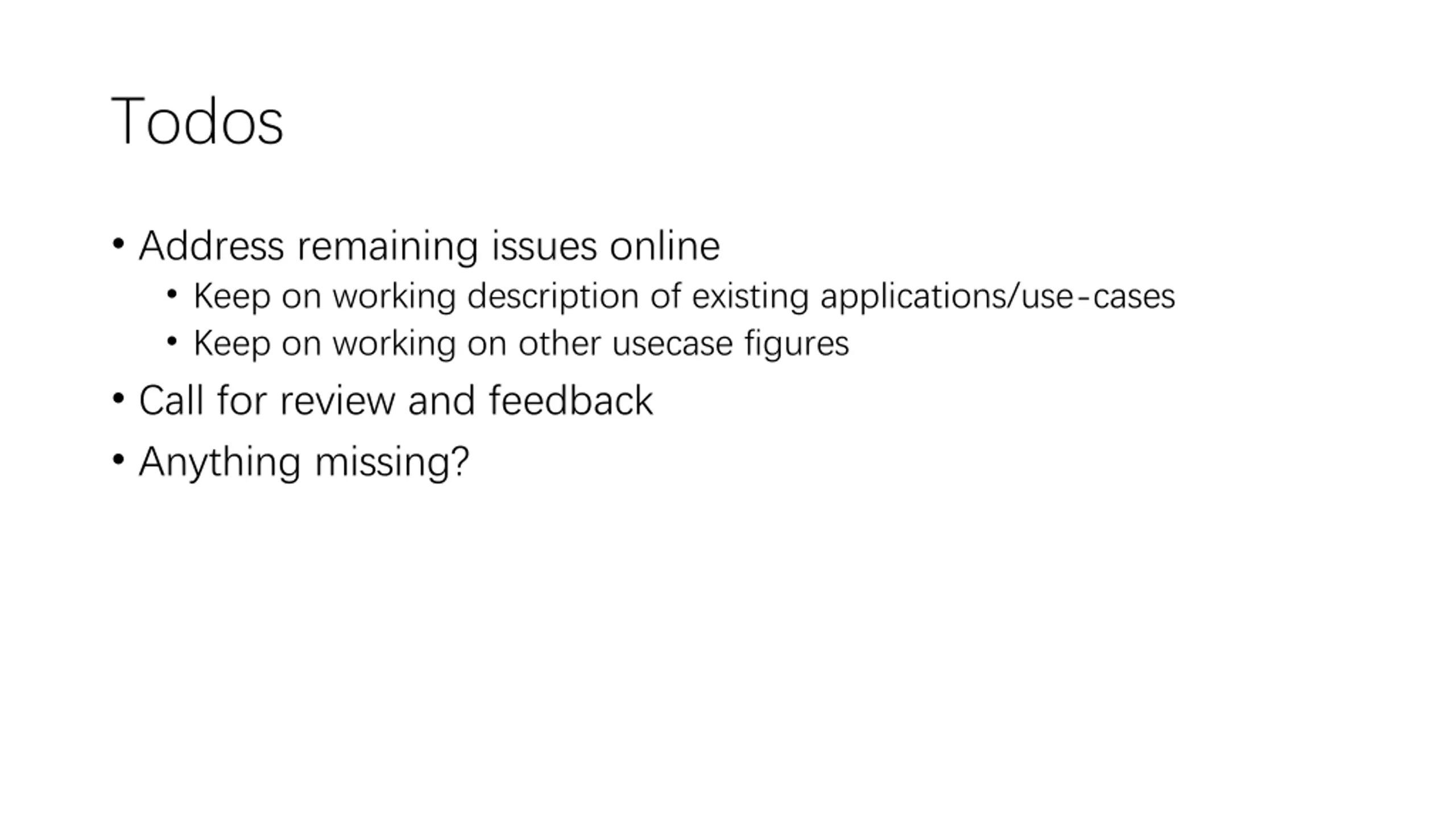 Todos Address remaining issues online Keep on working description of existing applications/use-cases Keep on working on other usecase figures Call for review and feedback Anything missing?