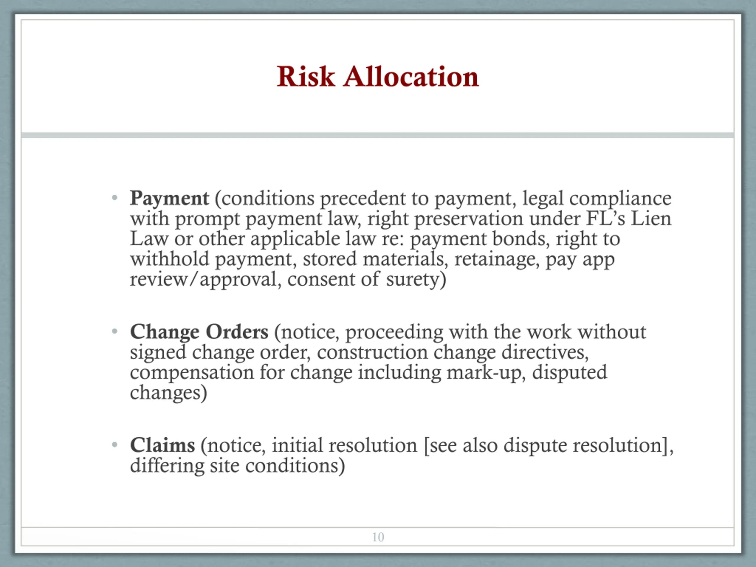 Risk Allocation Payment (conditions precedent to payment, legal compliance with prompt payment law, right preservation under FL s Lien Law or other applicable law re: payment bonds, right to withhold payment, stored materials, retainage, pay app review/approval, consent of surety) Change Orders (notice, proceeding with the work without signed change order, construction change directives, compensation for change including mark-up, disputed changes) Claims (notice, initial resolution [see also dispute resolution], differing site conditions) 10