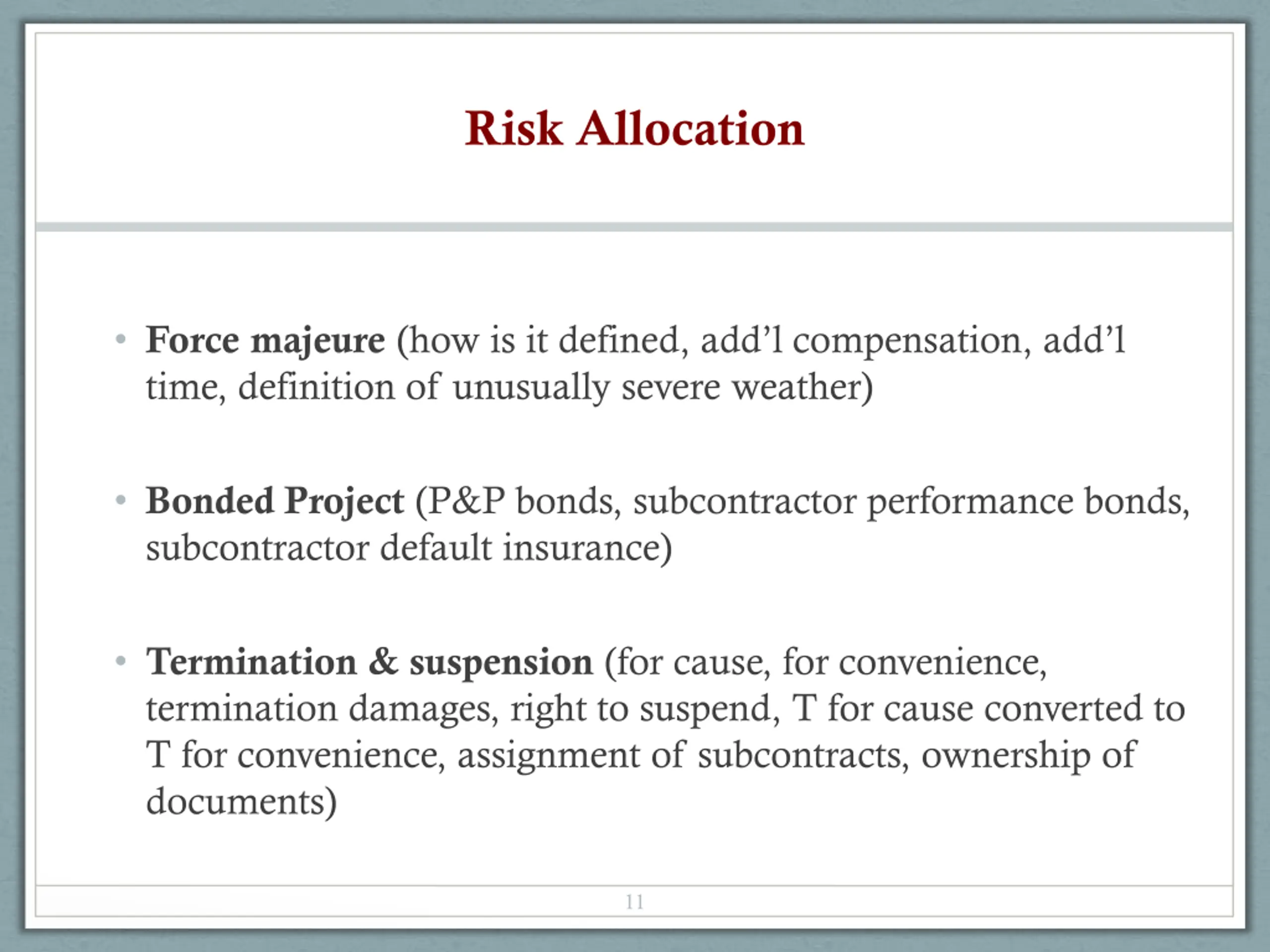 Risk Allocation Force majeure (how is it defined, add l compensation, add l time, definition of unusually severe weather) Bonded Project (P&P bonds, subcontractor performance bonds, subcontractor default insurance) Termination & suspension (for cause, for convenience, termination damages, right to suspend, T for cause converted to T for convenience, assignment of subcontracts, ownership of documents) 11