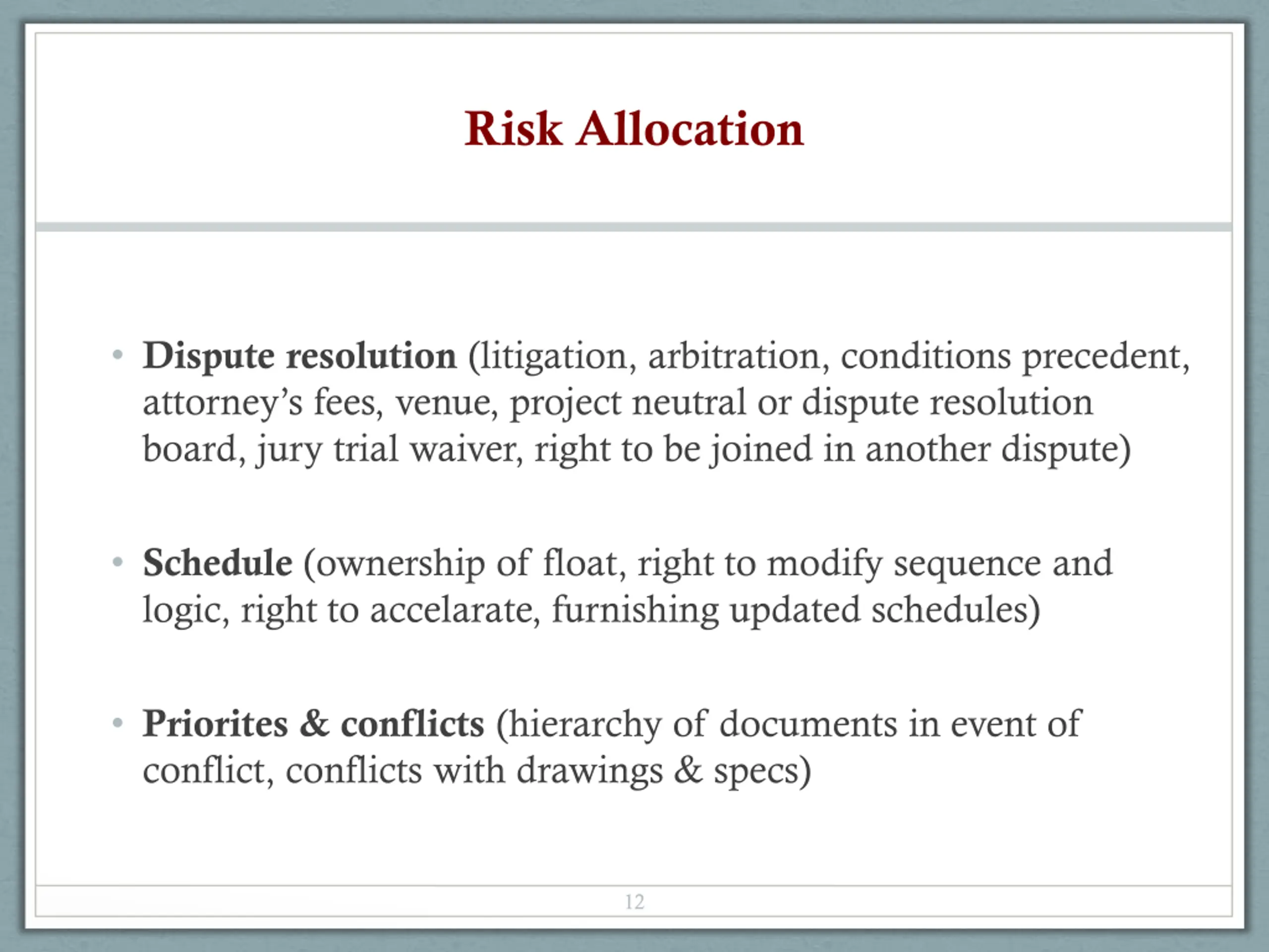 Risk Allocation Dispute resolution (litigation, arbitration, conditions precedent, attorney s fees, venue, project neutral or dispute resolution board, jury trial waiver, right to be joined in another dispute) Schedule (ownership of float, right to modify sequence and logic, right to accelarate, furnishing updated schedules) Priorites & conflicts (hierarchy of documents in event of conflict, conflicts with drawings & specs) 12