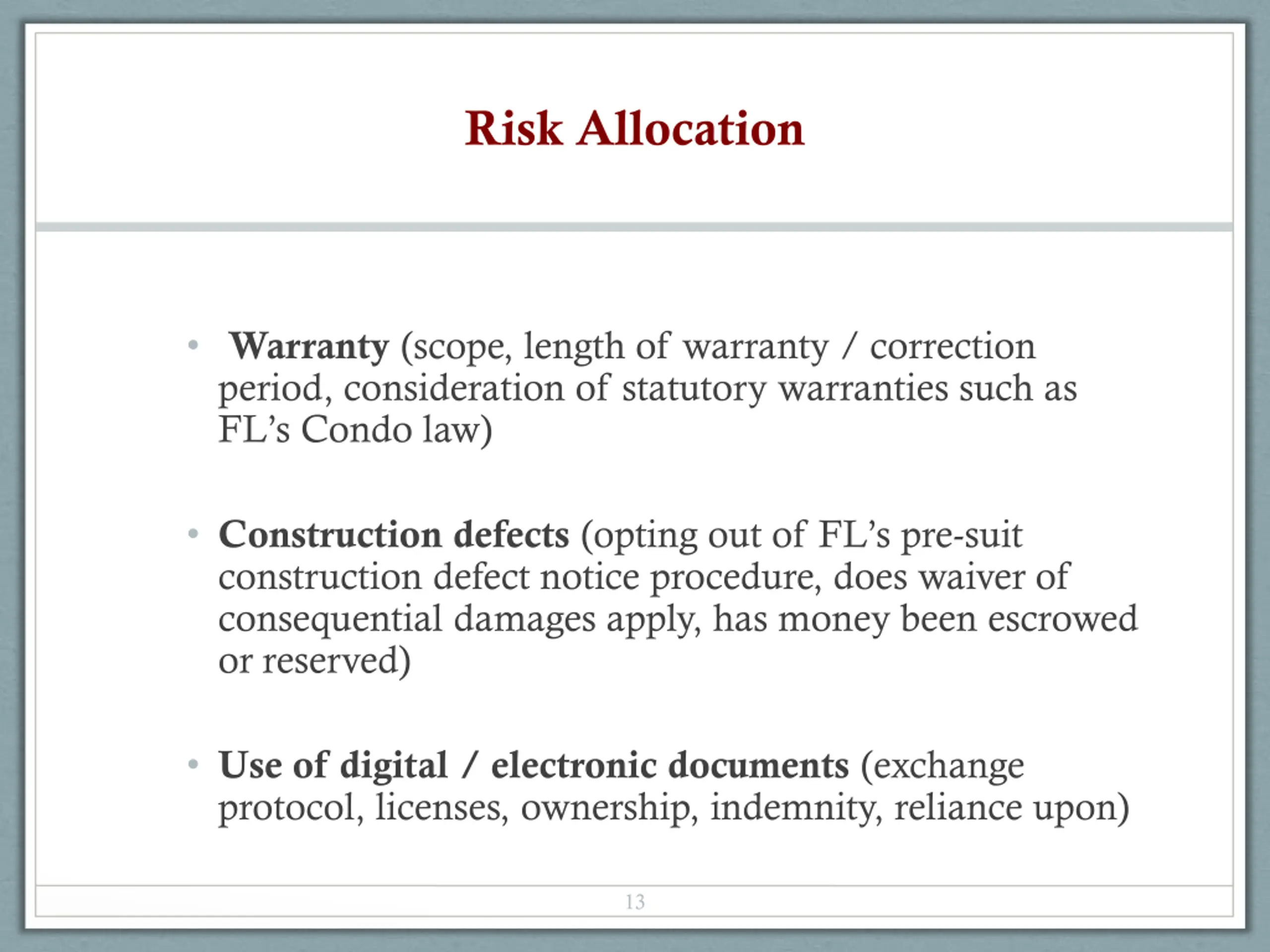Risk Allocation Warranty (scope, length of warranty / correction period, consideration of statutory warranties such as FL s Condo law) Construction defects (opting out of FL s pre-suit construction defect notice procedure, does waiver of consequential damages apply, has money been escrowed or reserved) Use of digital / electronic documents (exchange protocol, licenses, ownership, indemnity, reliance upon) 13