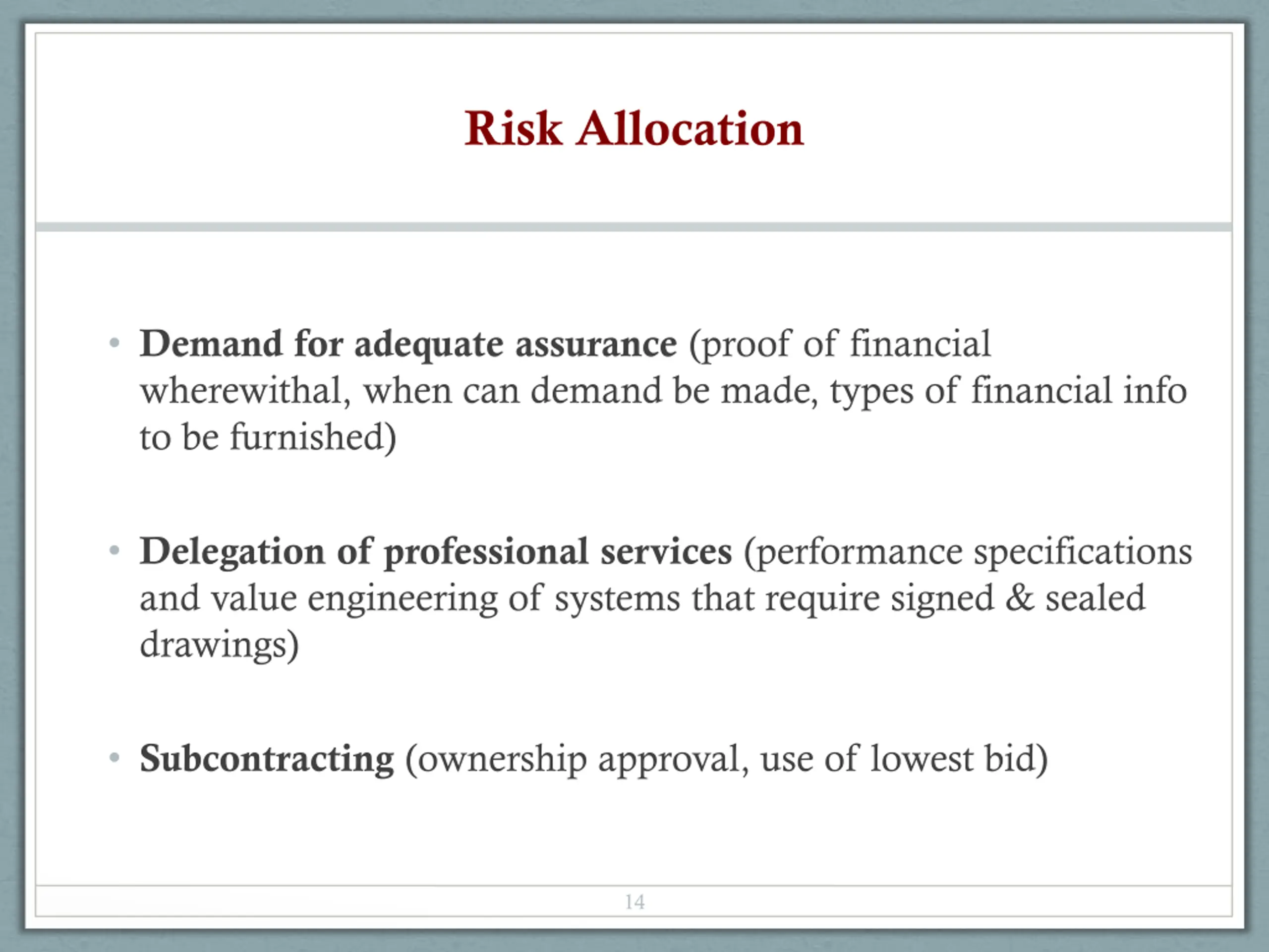 Risk Allocation Demand for adequate assurance (proof of financial wherewithal, when can demand be made, types of financial info to be furnished) Delegation of professional services (performance specifications and value engineering of systems that require signed & sealed drawings) Subcontracting (ownership approval, use of lowest bid) 14