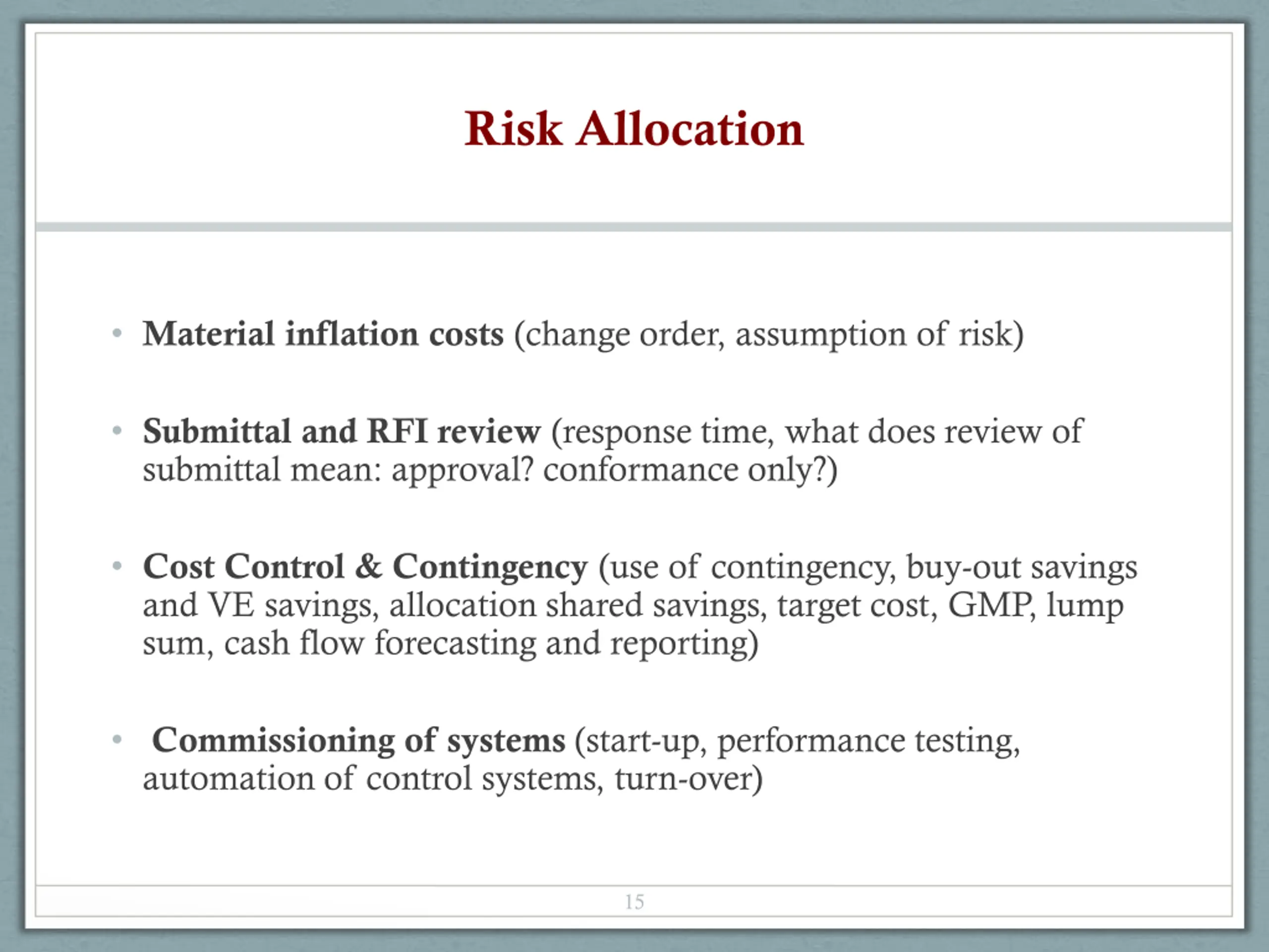 Risk Allocation Material inflation costs (change order, assumption of risk) Submittal and RFI review (response time, what does review of submittal mean: approval? conformance only?) Cost Control & Contingency (use of contingency, buy-out savings and VE savings, allocation shared savings, target cost, GMP, lump sum, cash flow forecasting and reporting) Commissioning of systems (start-up, performance testing, automation of control systems, turn-over) 15